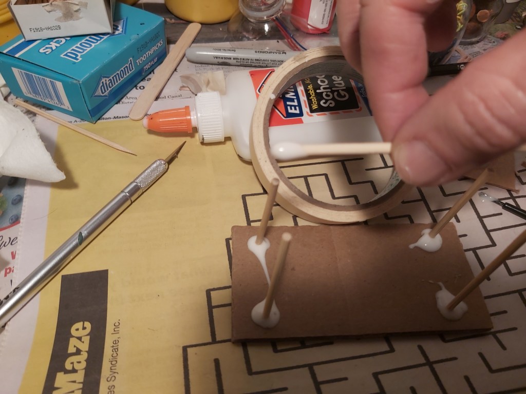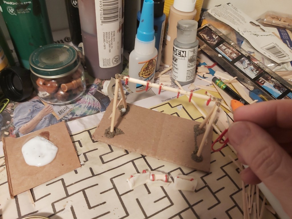 Test-fit bamboo skewer parts, then poke holes in the base for the posts. Blob glue over the holes and place the poles. Flock glue with sand. Bend them to the middle and glue the top bar on, supporting with masking tape until dry. Glue and place the cross-supports evenly, clamp with clothespins or tape.