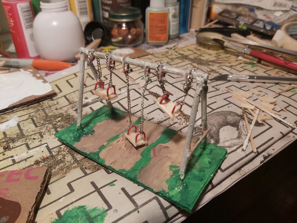 Dust structure with silver paint, leaving some white for that oxidized look. Don’t paint the seats or handles unless you want to. Don’t paint the chains, unless you want to add rust effects. Paint the grass with 2 greens, and the wear stripes with 2 browns. Kids wind swings around. Test that if you like.