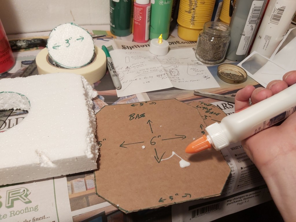 For the base, measure and cut a clean, flat piece of corrugated cardboard, 6” square, then cut 1” angles from the corners. For the Styrofoam rocks base slot, cut a 3” round hole. For the top lamp deck, measure and cut a 3” round corrugated cardboard platform.