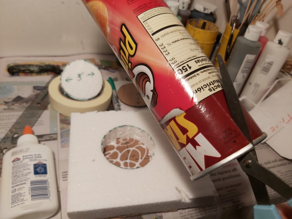 Leaving the bottom of the tube can intact, cut straight down opposite sides from the top and twist them in over each other, so the top is about as big around as the tea light. Mark the edges with a sharpie, glue and tape all the way down. Test-fit the can with the Styrofoam rocks slot. Adjust, glue and let dry.