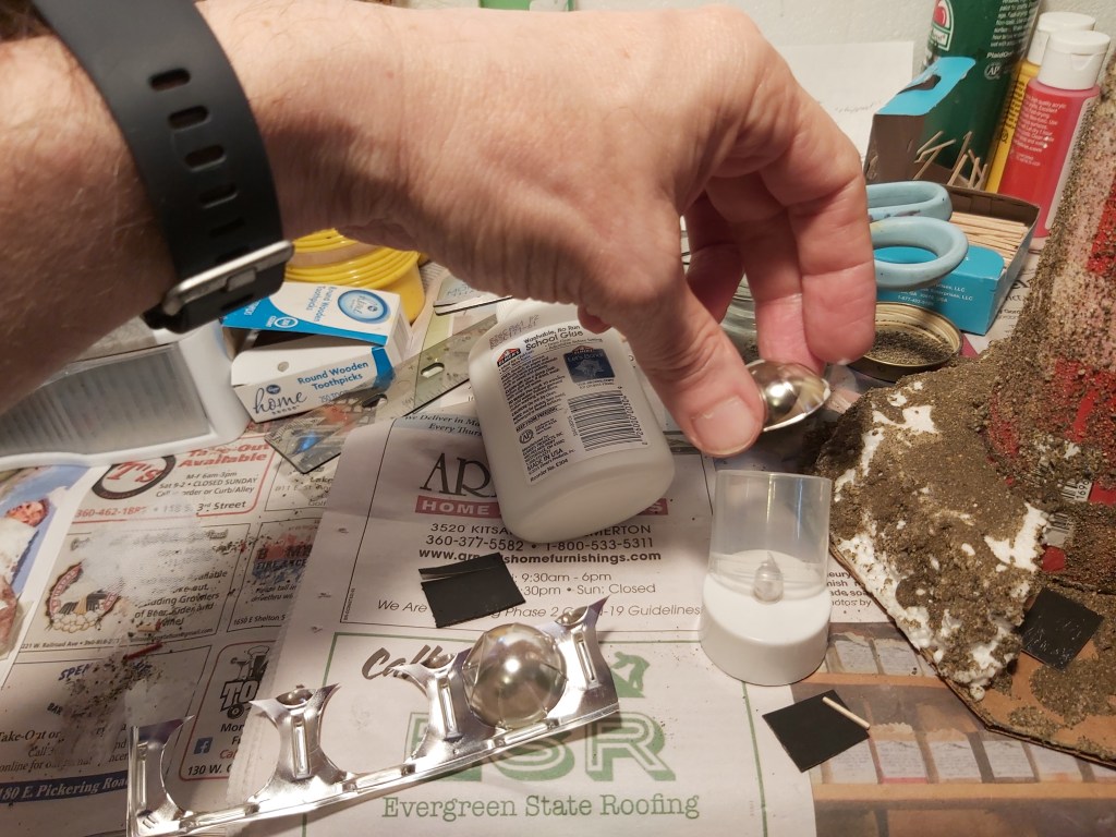 Glue clear and top lids to tea light. Cut thin card doors, glue on. Add rubber band for the top rail. Paint all with glue, flock with sand, let dry. Prime in white, prime base in gray. Cut window frames, glue clear plastic to back, cut holes in tower side, glue on. Paint color, touch up. Test, check and adjust.