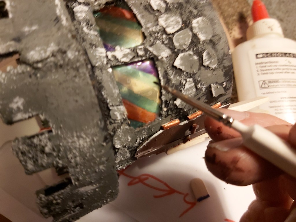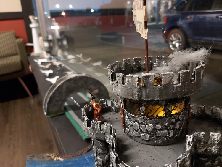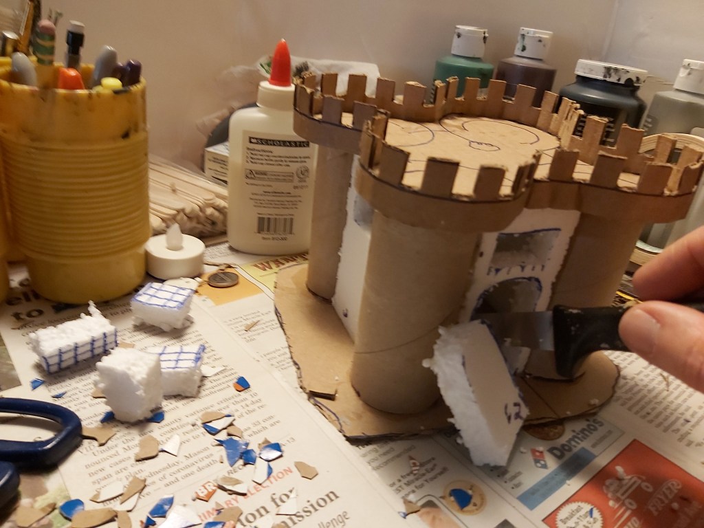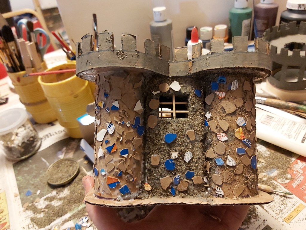 Mix some glue, water and sand into your black paint. Coat the entire exterior in black. Let dry. Next, paint the raised surfaces in grey using the same method. Let dry. Pick out the high spots and paint white. Let dry. Paint the exterior doors brown. Mix brown and green to paint the base around the bottom of the castle – it’s okay to be sloppy and get a bit on the lower rocks for realism. Add details as you see fit.