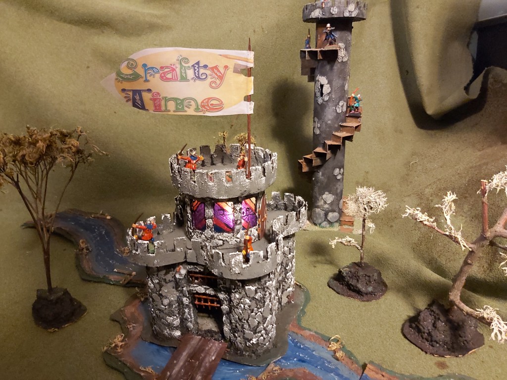 They say a man’s (or woman’s) home is his (or her) castle. Personalize yours as you see fit. Shown here is the castle along with water and trees from earlier Crafty Time features. In the background is a tower I made previously, along with the archer figures (1/35th scale).