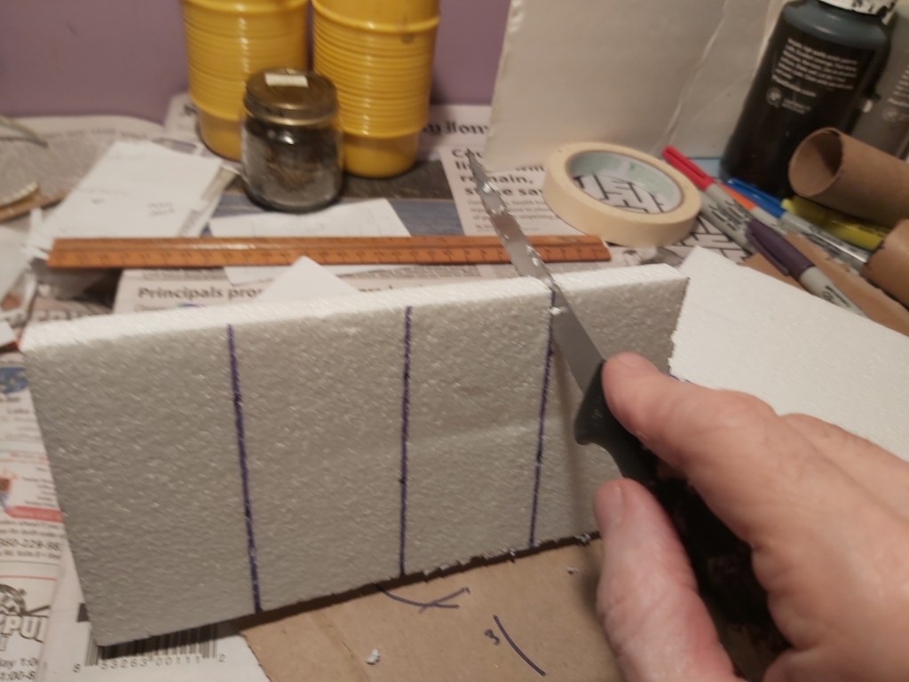 Using the height of the ground floor towers and the width you want, measure, mark and cut your Styrofoam walls. For this example, I wanted a fairly small castle. But you could make a giant one! Be careful with sharp objects.