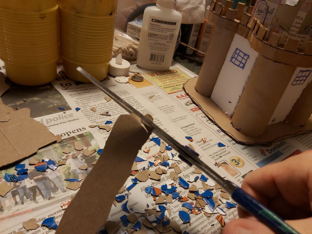 Cut down a section of larger cardboard tube. Shown is from a tea container, about 4” tall but you could change it up. Carefully cut out where your windows will be later. Trace, then add a half an inch and cut the roof. I also cut a hole in the middle of the roof for access. Do not attach this section to the castle deck.