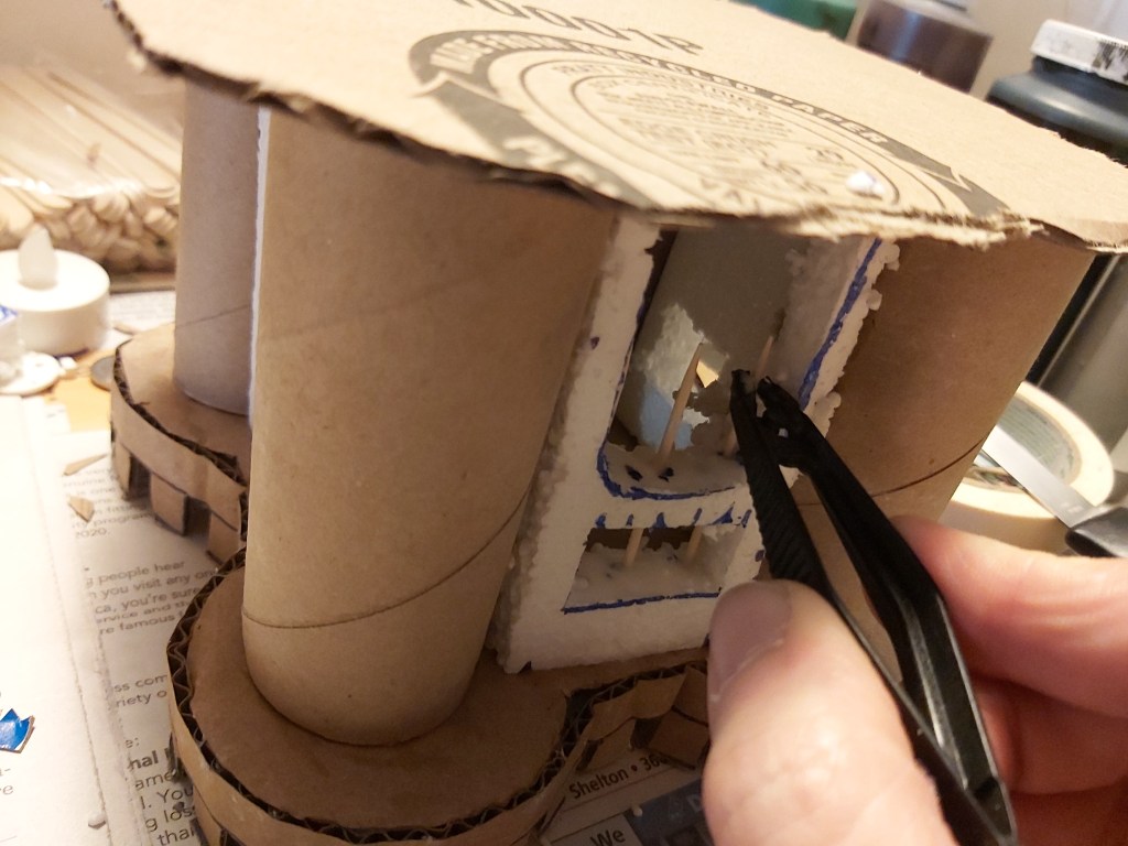 For portcullis verticals, use five full-length round toothpicks. Flip the building over, carefully (you might need tweezers) poke them through both parts of the Styrofoam and glue in place. Cut shorter lengths for the portcullis horizontals and the windows, poke them into both sides of the Styrofoam and glue in.