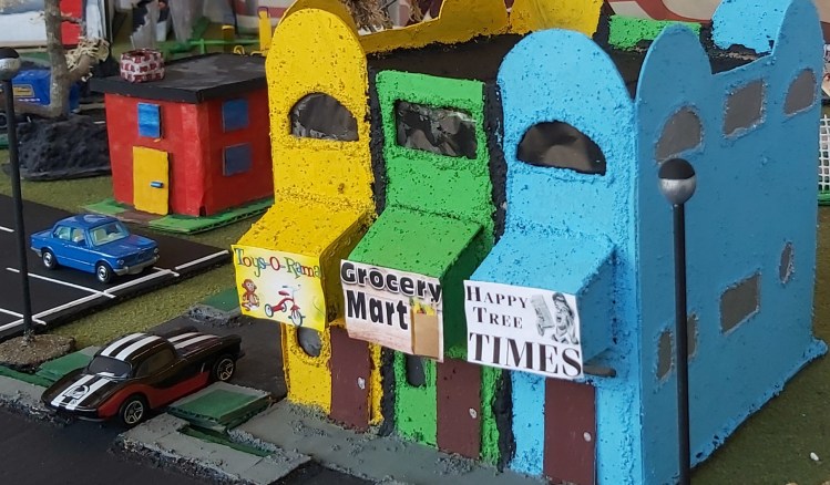Happy Tree City feels more complete with Toys-O-Rama, Grocery-Mart and the Happy Tree Times. But it needs more, so we will continue next week. Until then, keep crafting. You’re never too old!