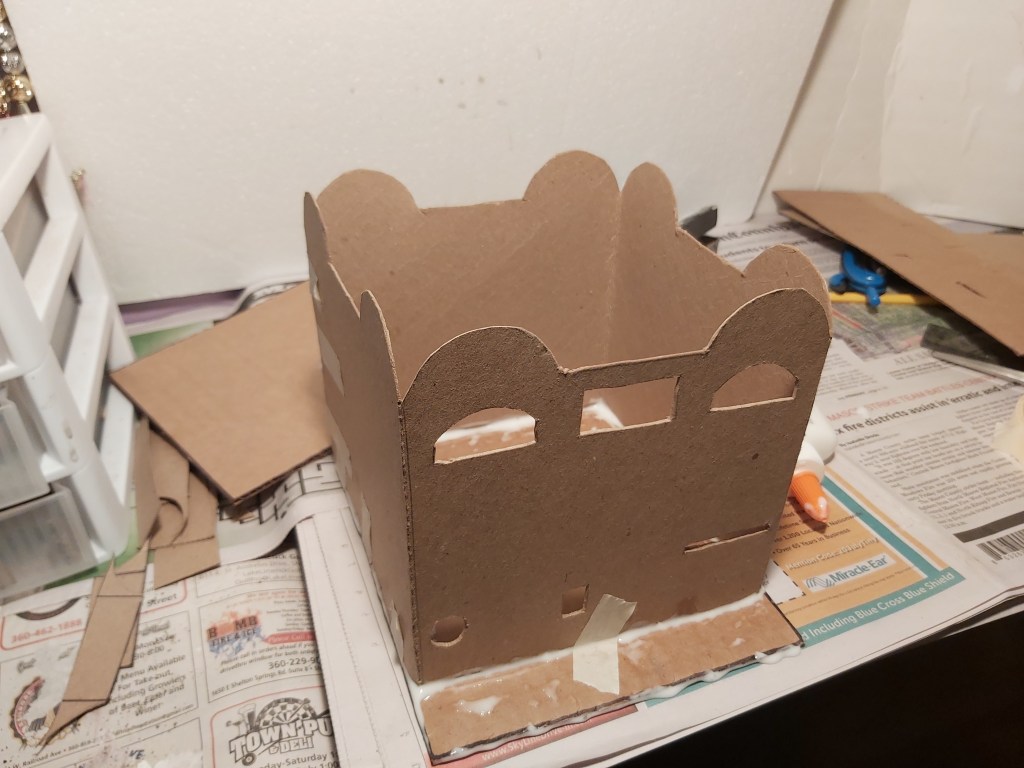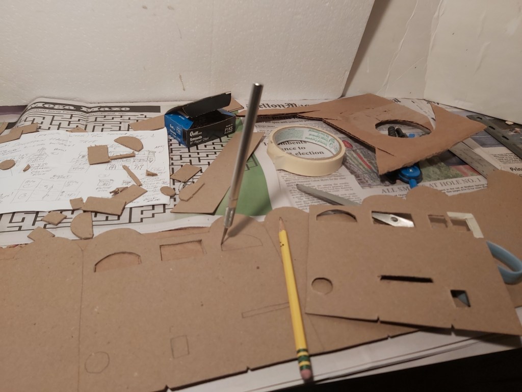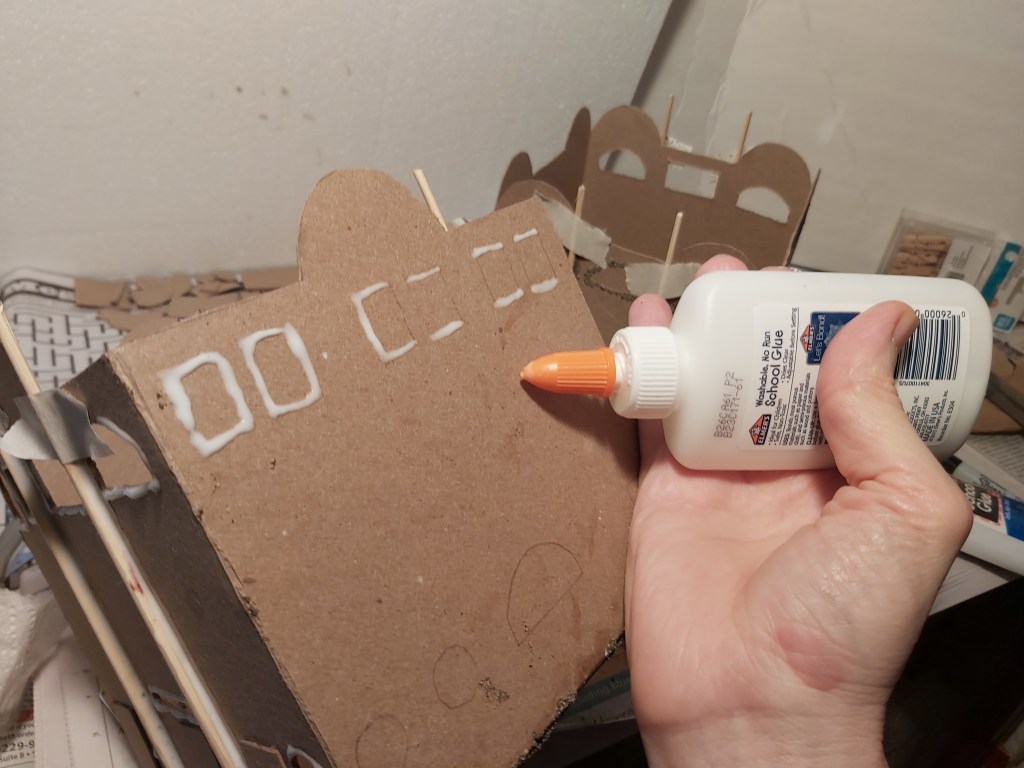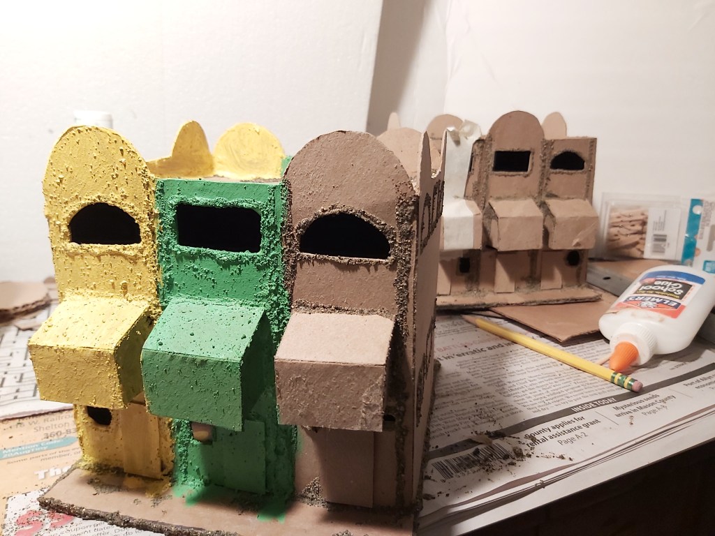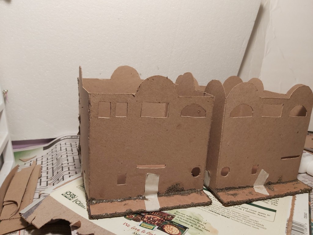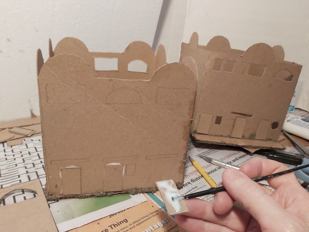 Measure and cut a 6” cardboard square. Customize windows as you see fit to make a storefront template. Measure and cut ¾” wide x 1 ½” tall doors. Using your template, trace and cut as many walls as desired. Glue the walls to a 7” x 6” base allowing 1” sidewalk in front, and clamp with masking tape until dry. Glue doors on. Cut windows out &/or trace pencil lines using your template.