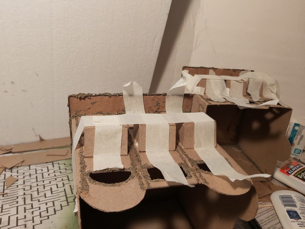 Measure and cut three pieces of cardboard, 1 ½” wide x 2” tall. Fold each neatly in half and check the angle you want with a test fit on the building. Trace the support shape until it fits right, then use it as a template and mark and cut six of those. Turn the building on its back, storefront facing up, and glue the awnings in place, clamping with masking tape. Let dry.