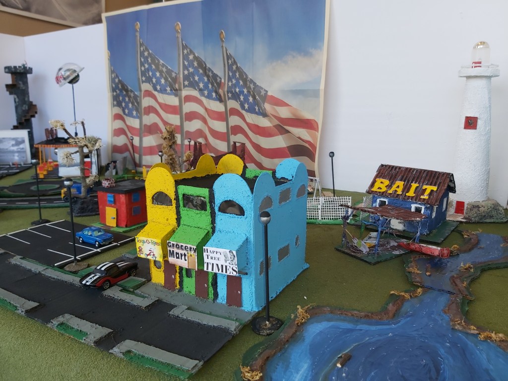Materials: Cardboard boxes, masking tape, school glue, ordinary sand, paper sign designs, thin clear plastic (from window envelopes), and acrylic paint.
