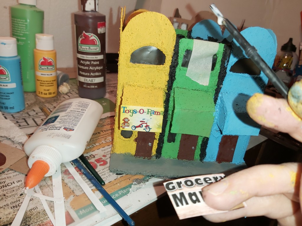 To create the illusion of three buildings, paint each a different color, with black between. Paint the side and back windows silver, the doors brown, the sidewalk grey, the roof black. Paint silver dots for door handles. Use an old brush to paint glue to the inside edges of the windows, then place the clear plastic from the inside. Paint glue evenly across the front of each awning and place each sign.