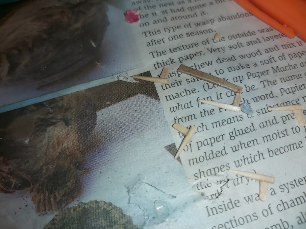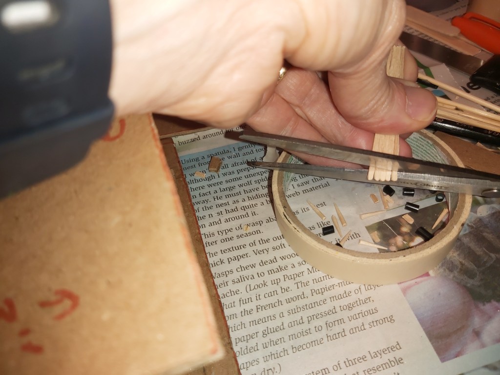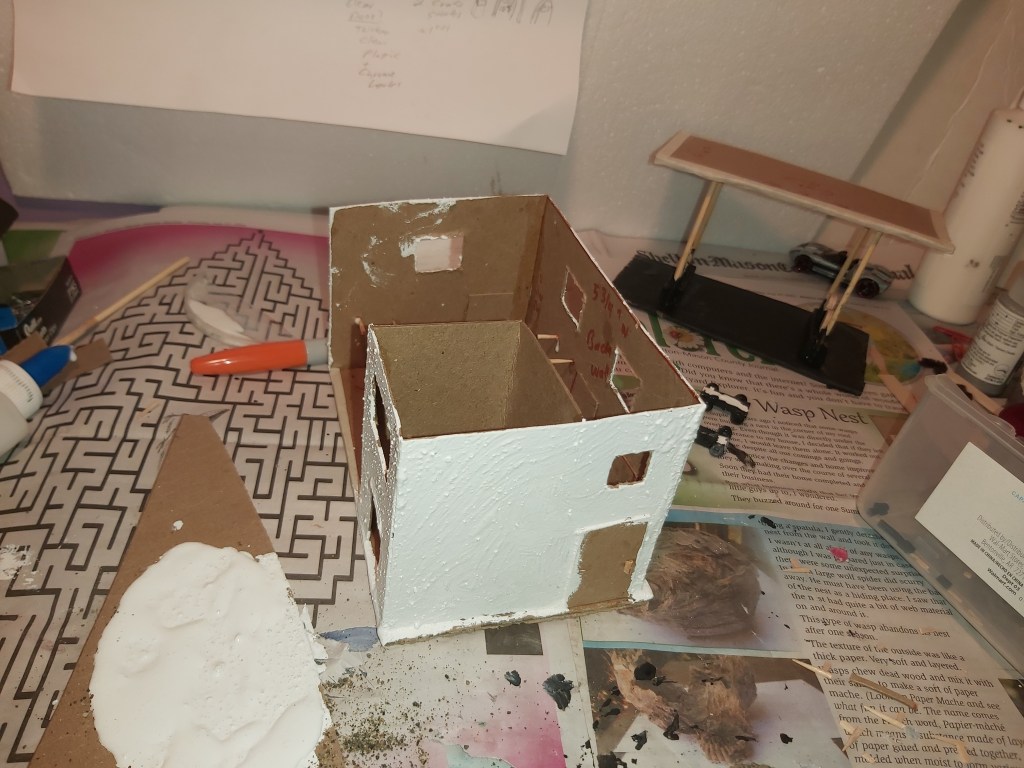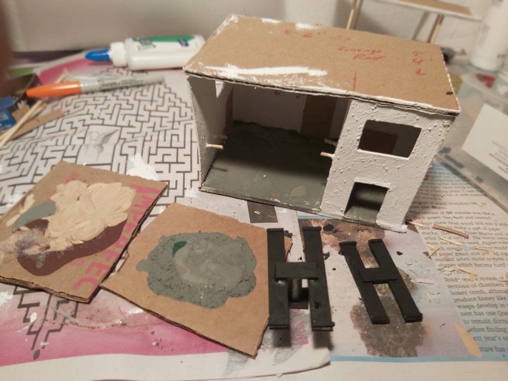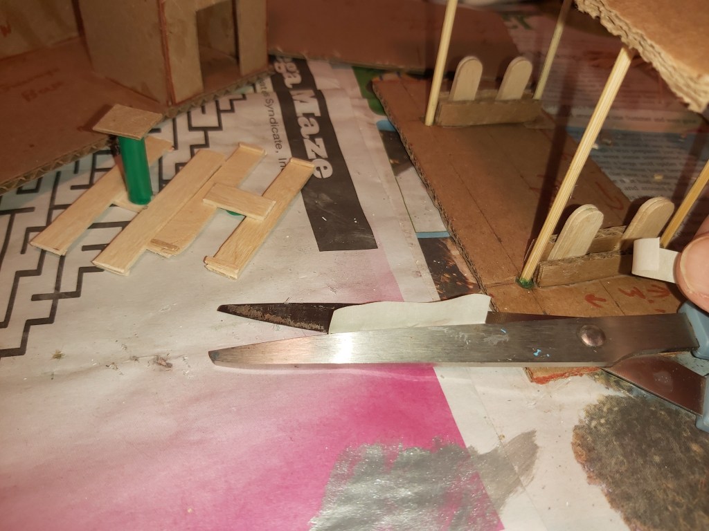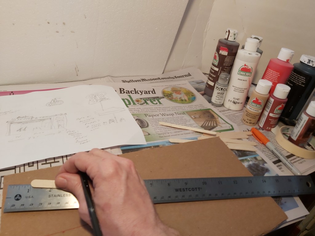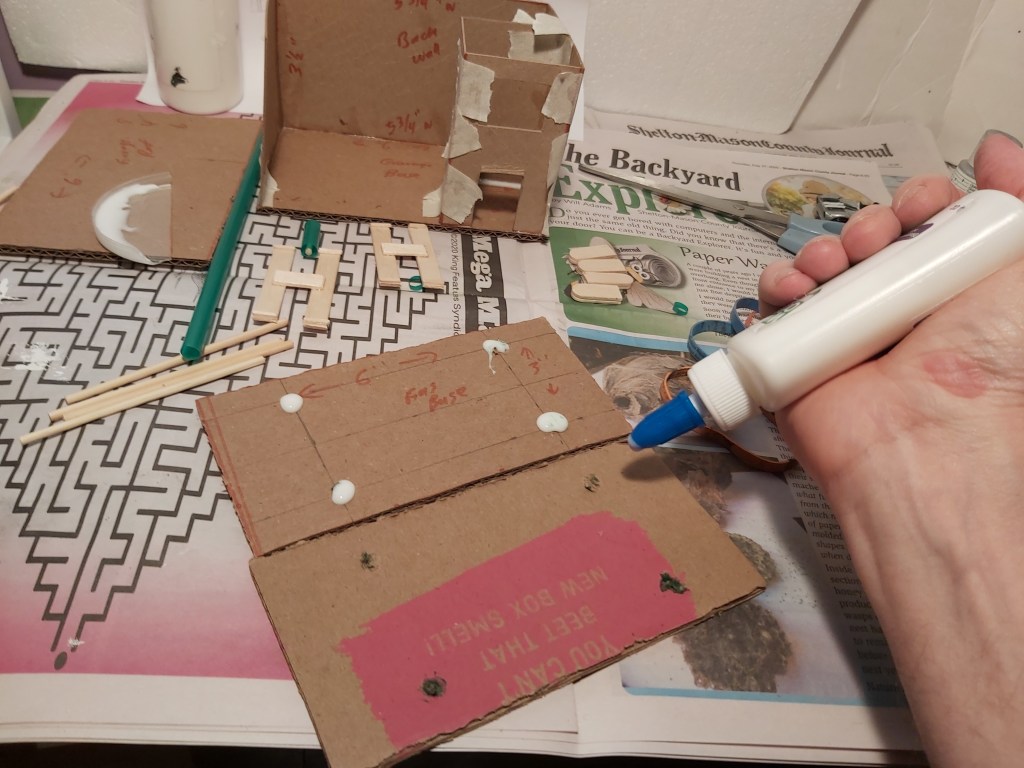 Materials: Corrugated and thin cardboard, regular sand, popsicle sticks, bamboo skewers, flat and round toothpicks, plastic straws, masking tape, paper signs, school glue, acrylic paints, clear plastic (from window envelopes, for window glass), small round beads.