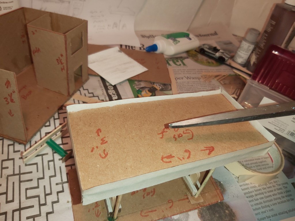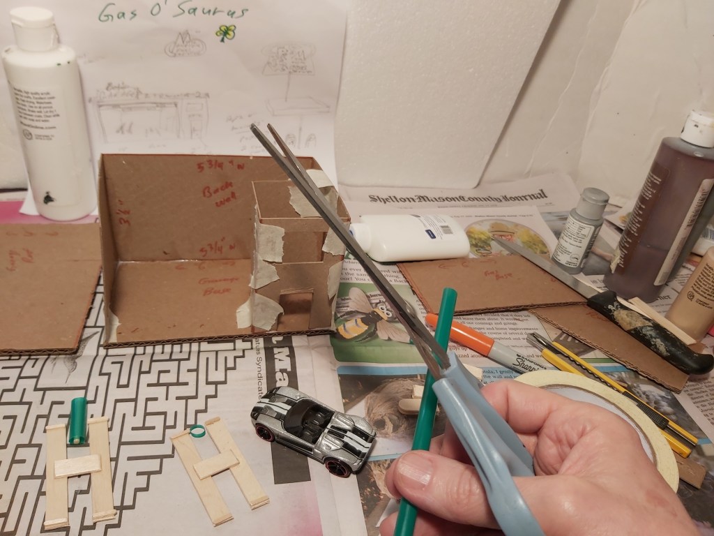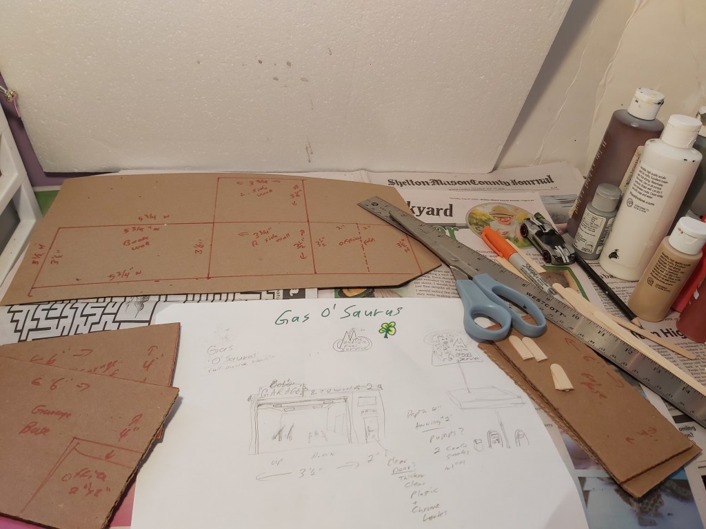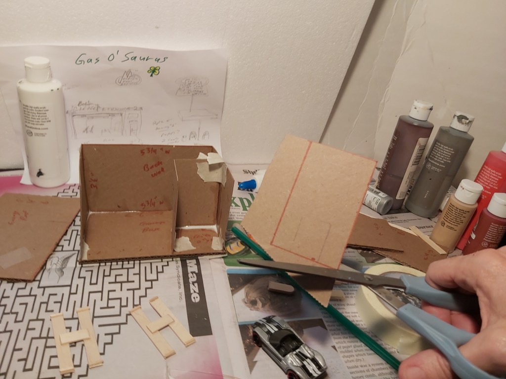 Use thin cardboard for walls to make details like windows easier, and corrugated cardboard for a strong floor and roof. The garage base and roof are 6”wide x 4” deep. The height is 3 ½” tall. The back wall is 5 ¾” wide x 3 ½” tall. Two side walls are 3 3/4” wide. For the office, fold a 4” wide x 3 ½” piece in half so the back wall is 2” wide. Glue and clamp with masking tape. The gas base and roof are 3” x 6”.