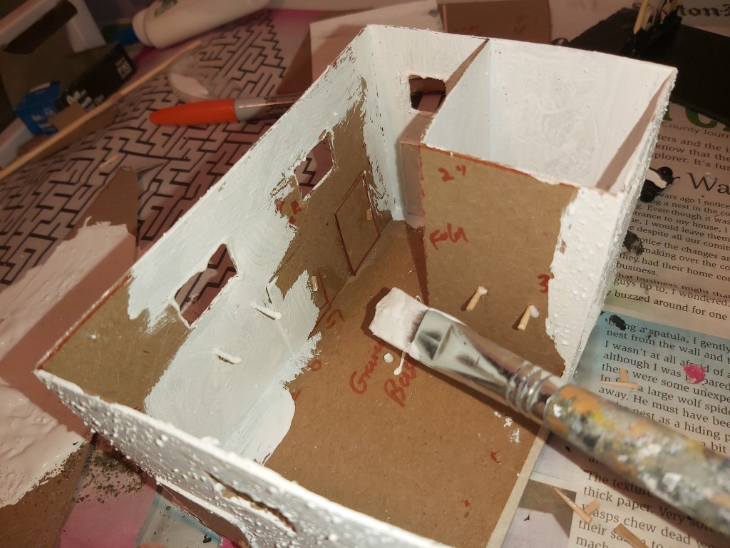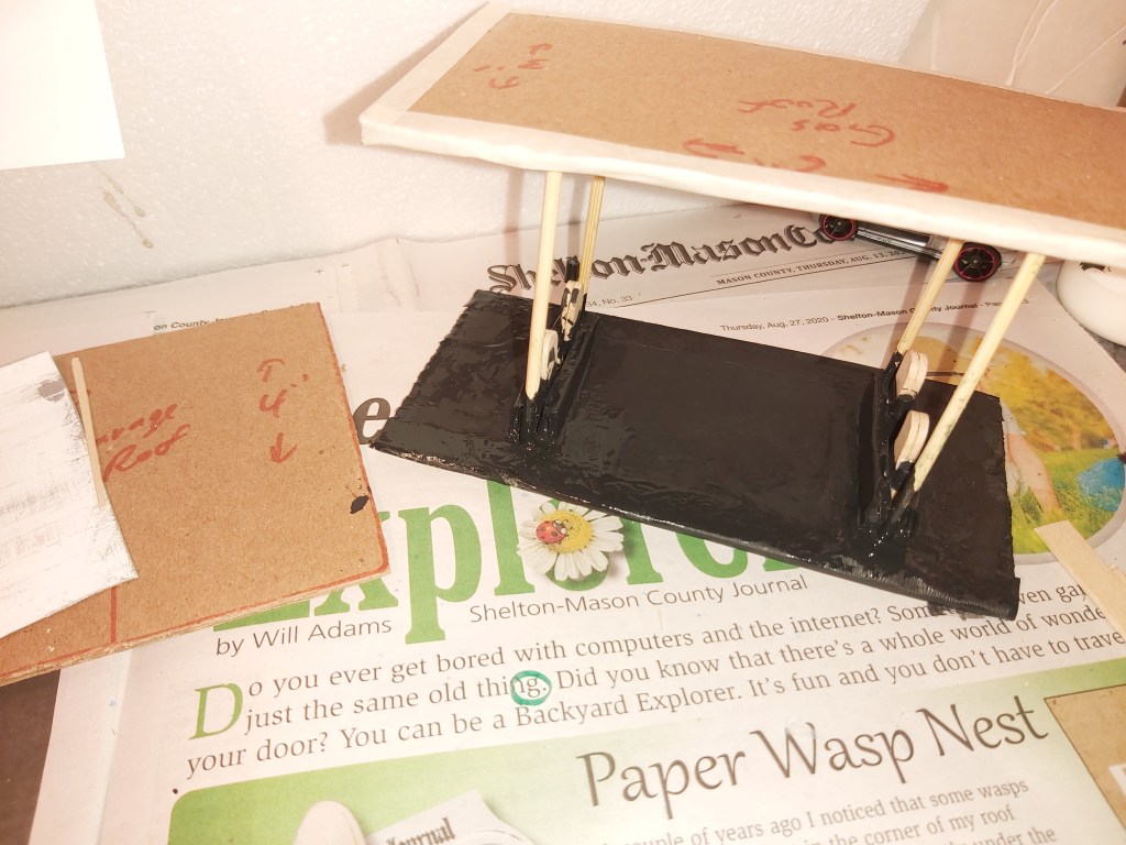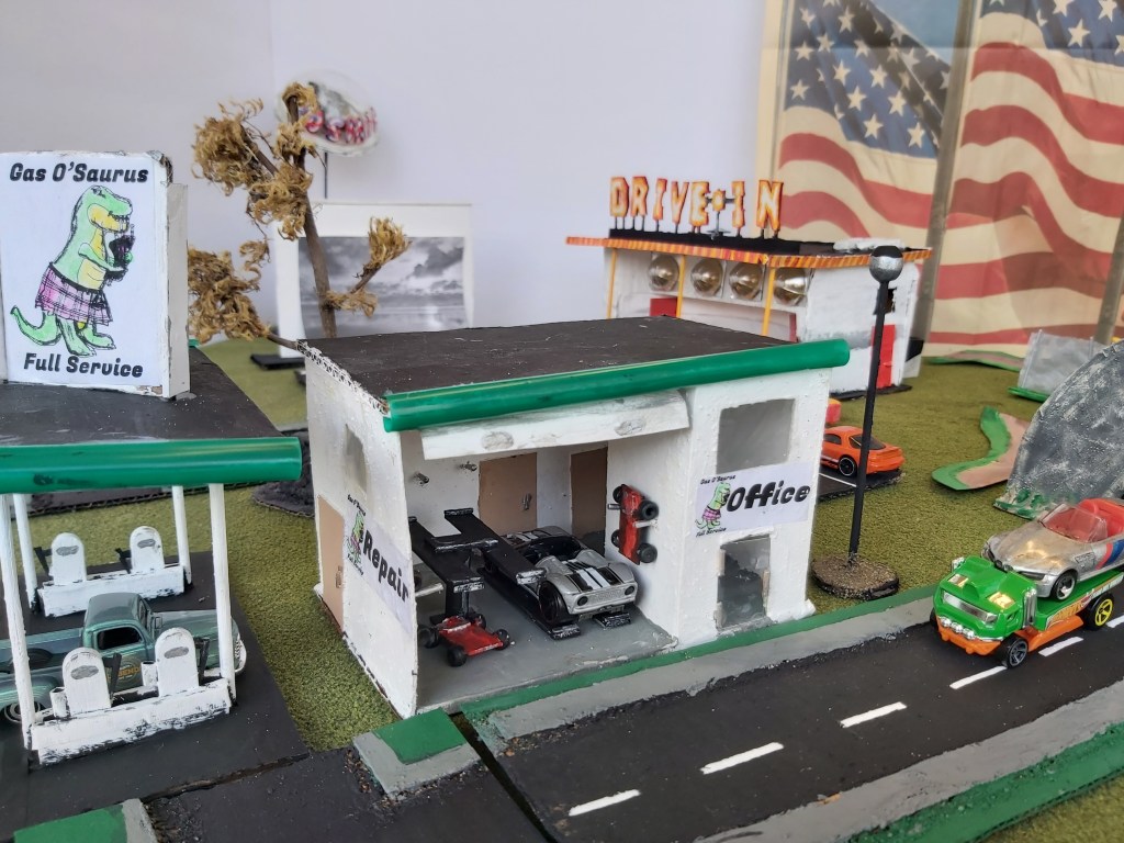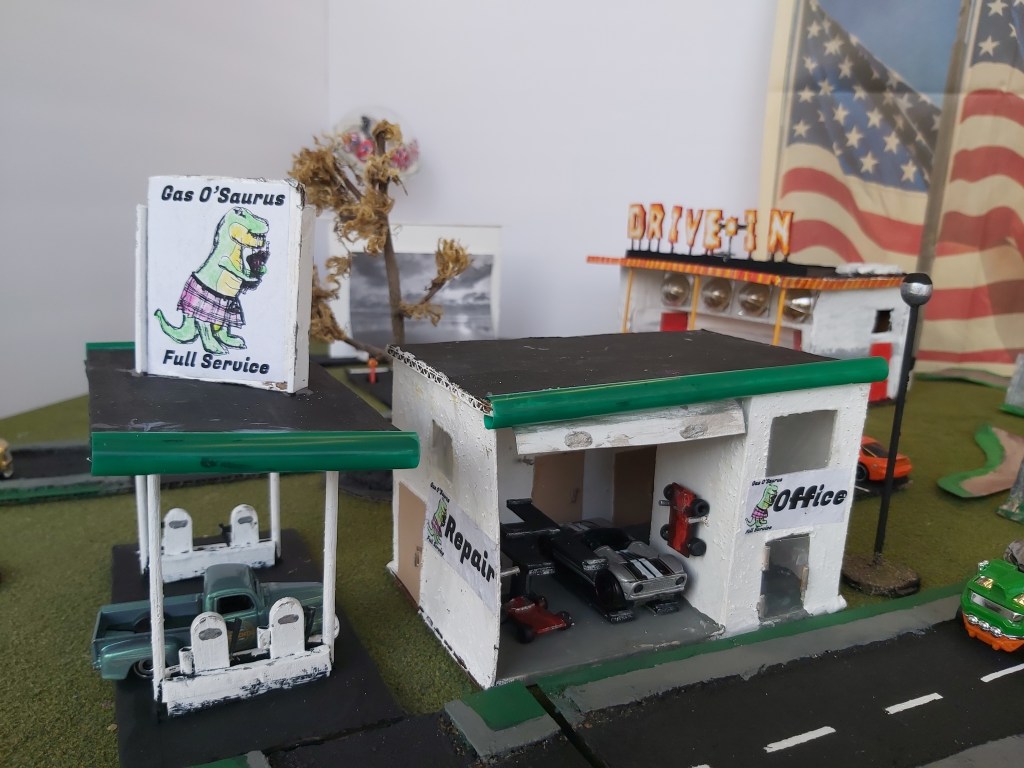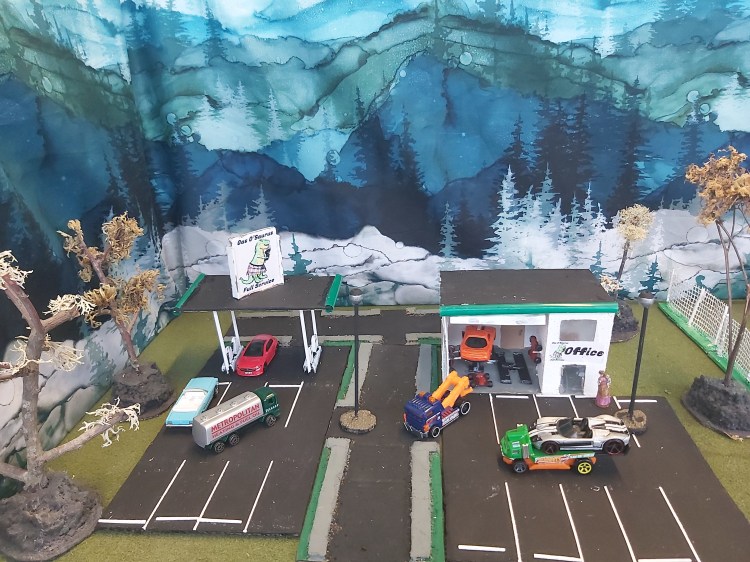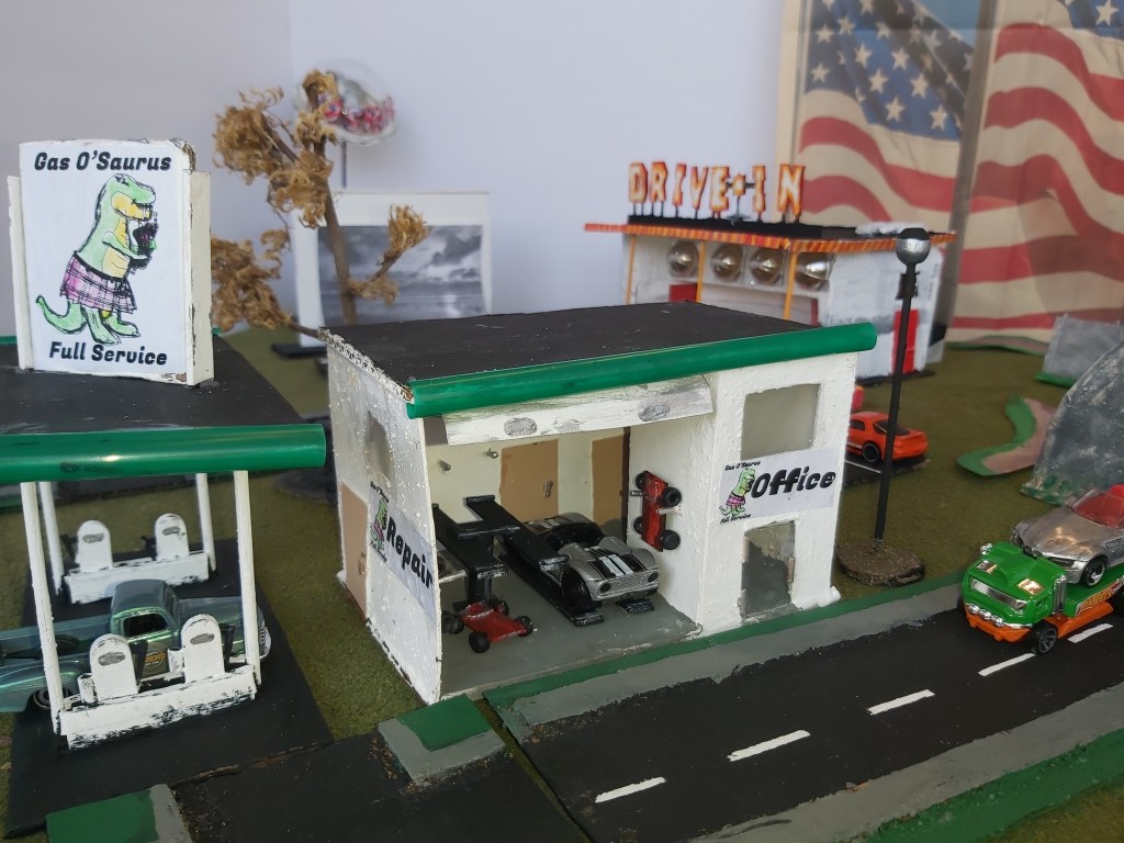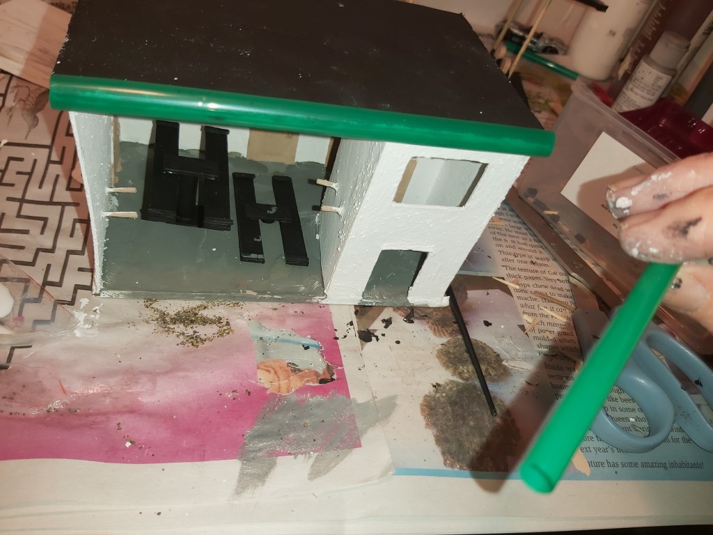 Cut out holes for windows, glue on ¾” x 1 ½” tall thin card doors for interior, sides and back. Base coat walls white, floor grey and roof black. Using thicker clear plastic cut a ¾” x 1 ½” door for the front office door. Glue on and cut sections of round toothpicks for hinges, and flat toothpick for the door handle. Cut a straw lengthwise and glue to the edges of the roofs. Glue garage roof and door on last. Add signs.