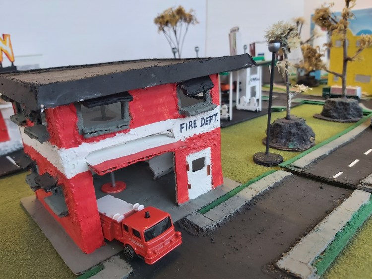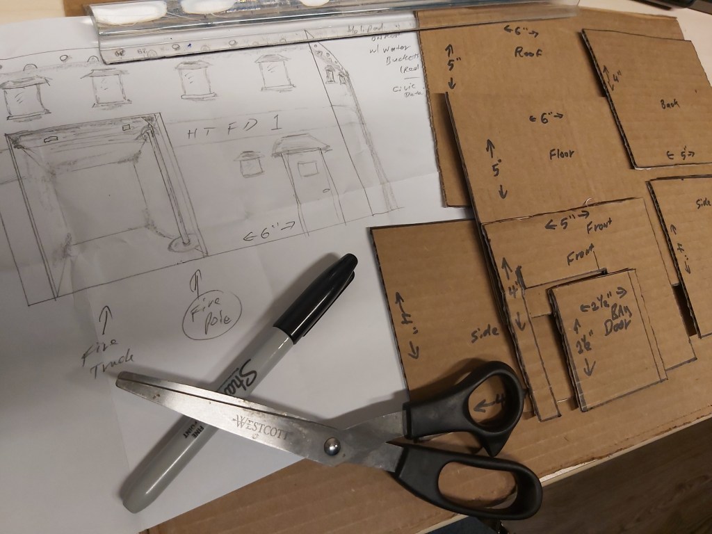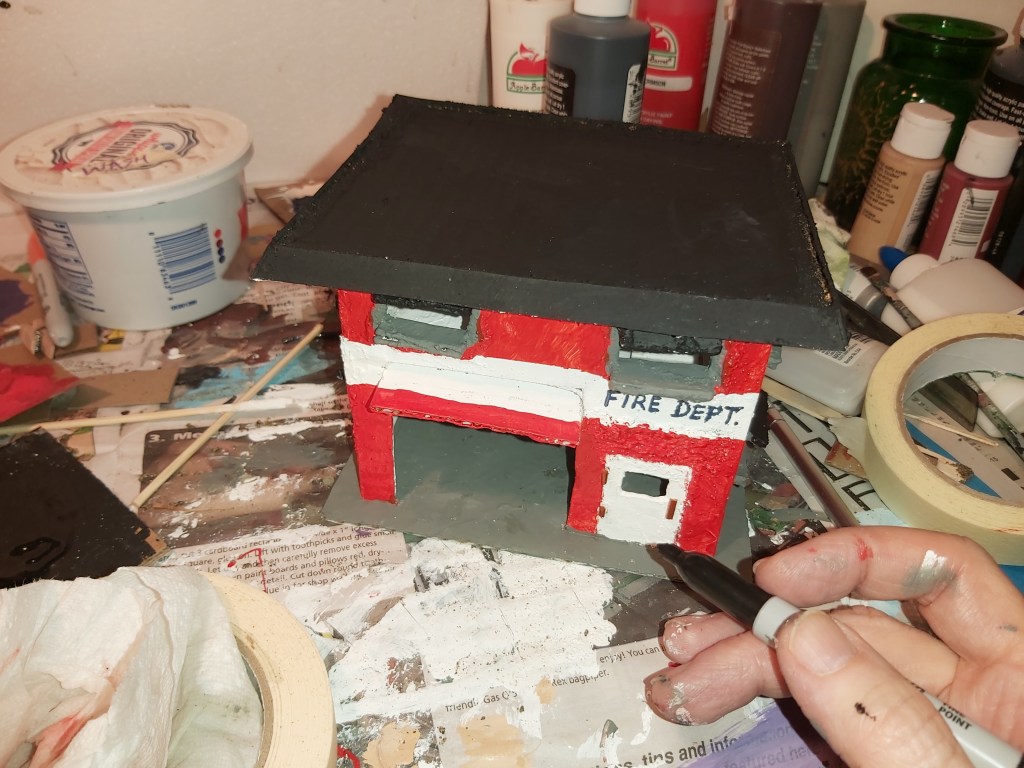 Use a fine tipped permanent black marker to add the FIRE DEPT. lettering above the door. Note the fireman’s pole visible through the top left window and the bay door. Thank you first responders!