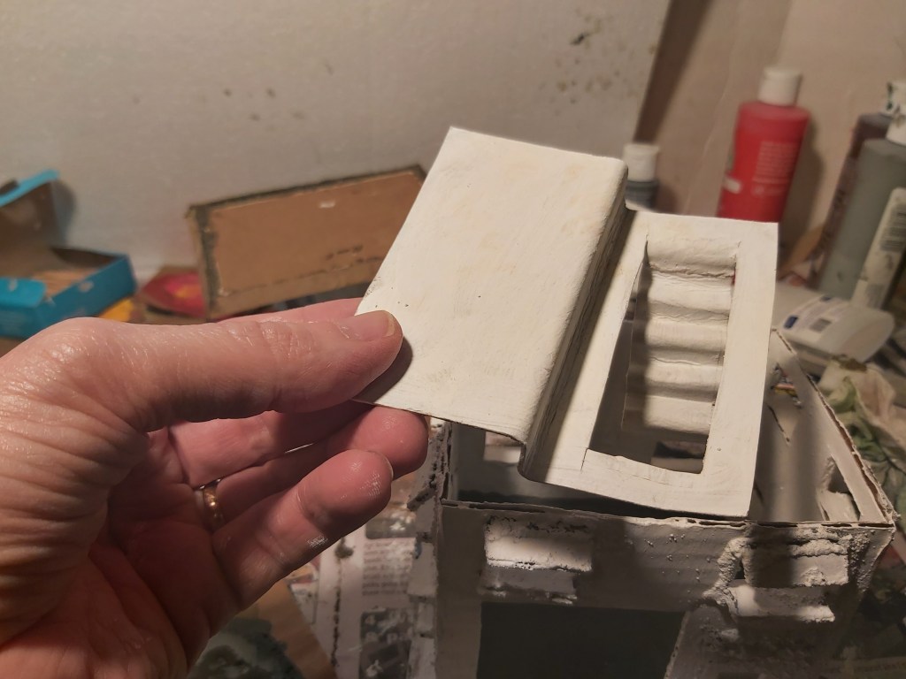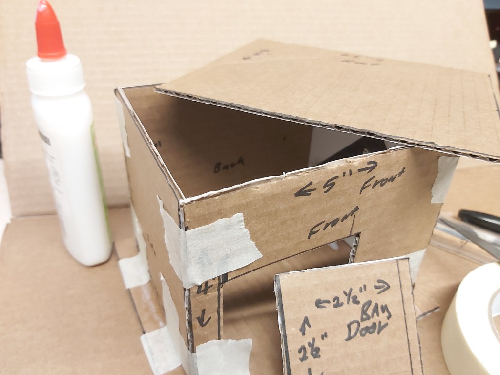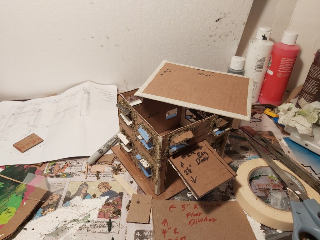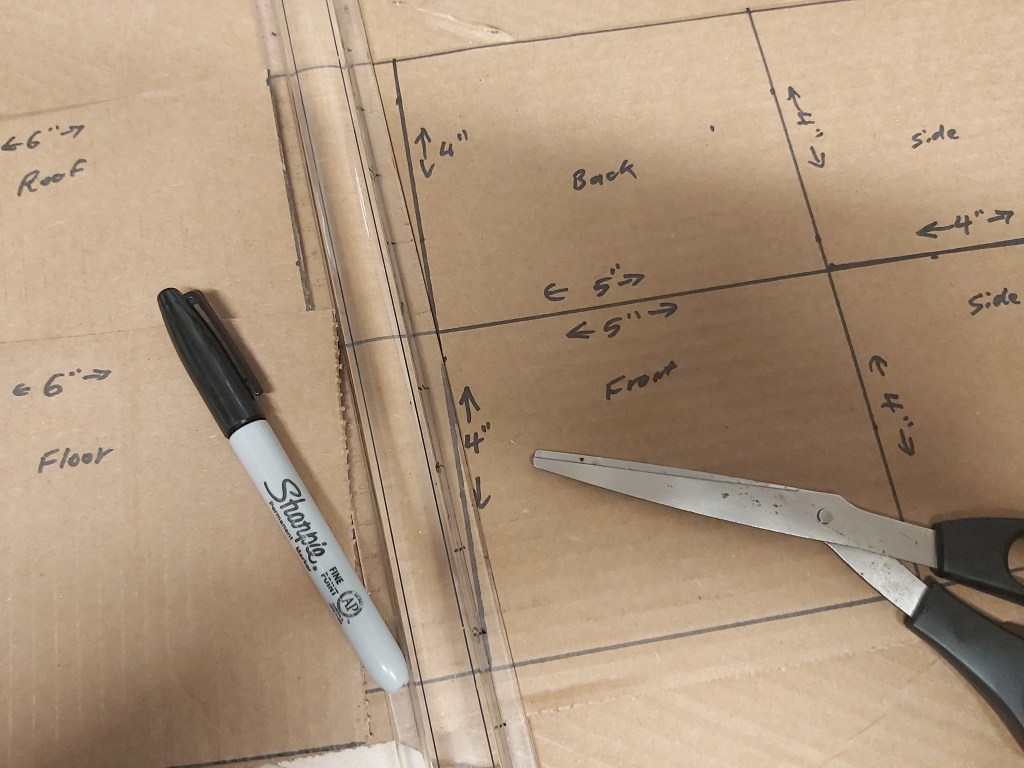 If you have an idea, draw it out first. The floor, roof and walls are corrugated cardboard. Base and roof are 6”wide x 5” deep. Front and back walls are 5” wide x 4” tall, side walls are 4” x 4”. Think, plan measure, mark and cut. Have extra cardboard handy. Test fit with masking tape and adjust as needed.