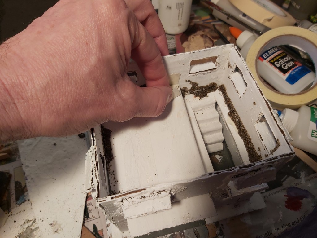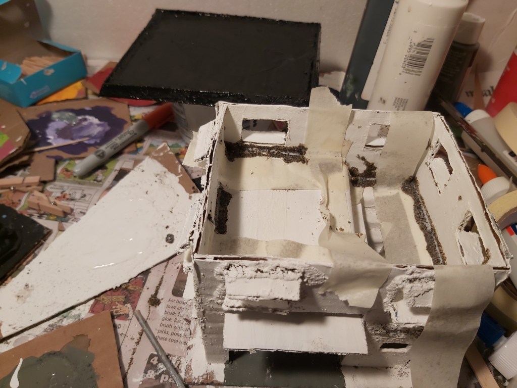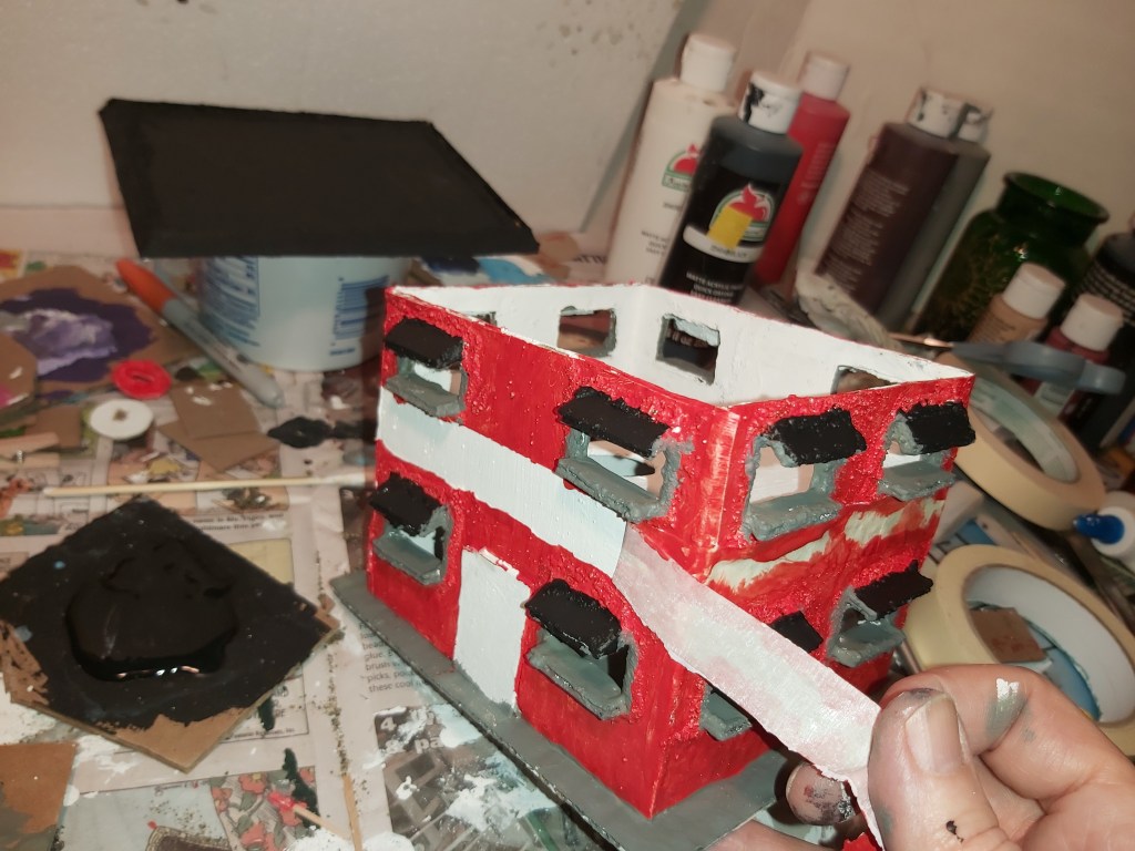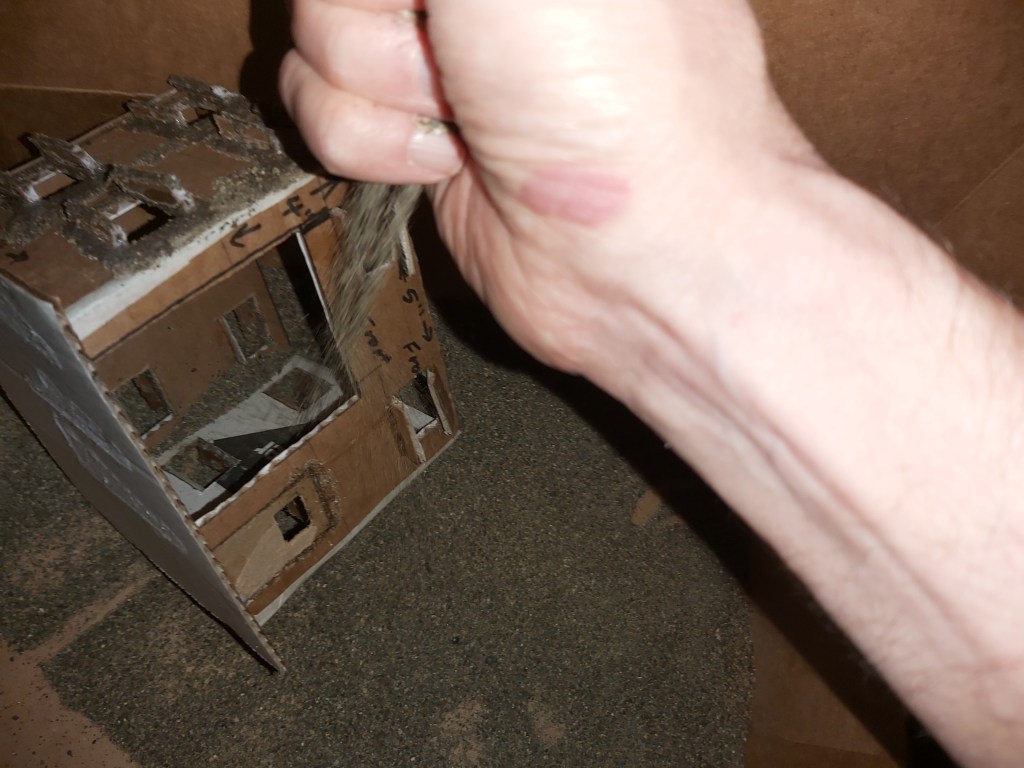 Mark and cut out windows. Glue wall and floor edges together, reinforce with masking tape and set aside to dry. Cut the removed window pieces in half for window ledges and awnings, glue to windows and flock with sand. Tilt off excess sand. Let dry. Add thin cardboard to the roof edges and prime underside white and top black.