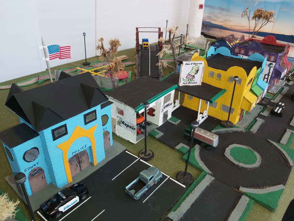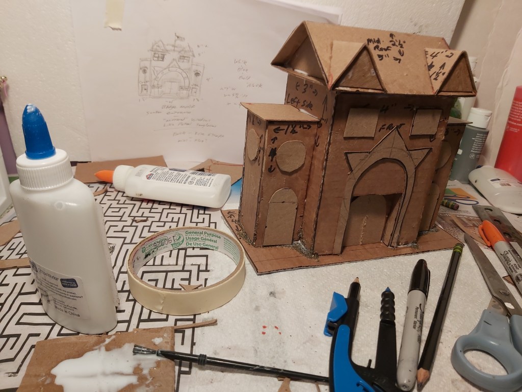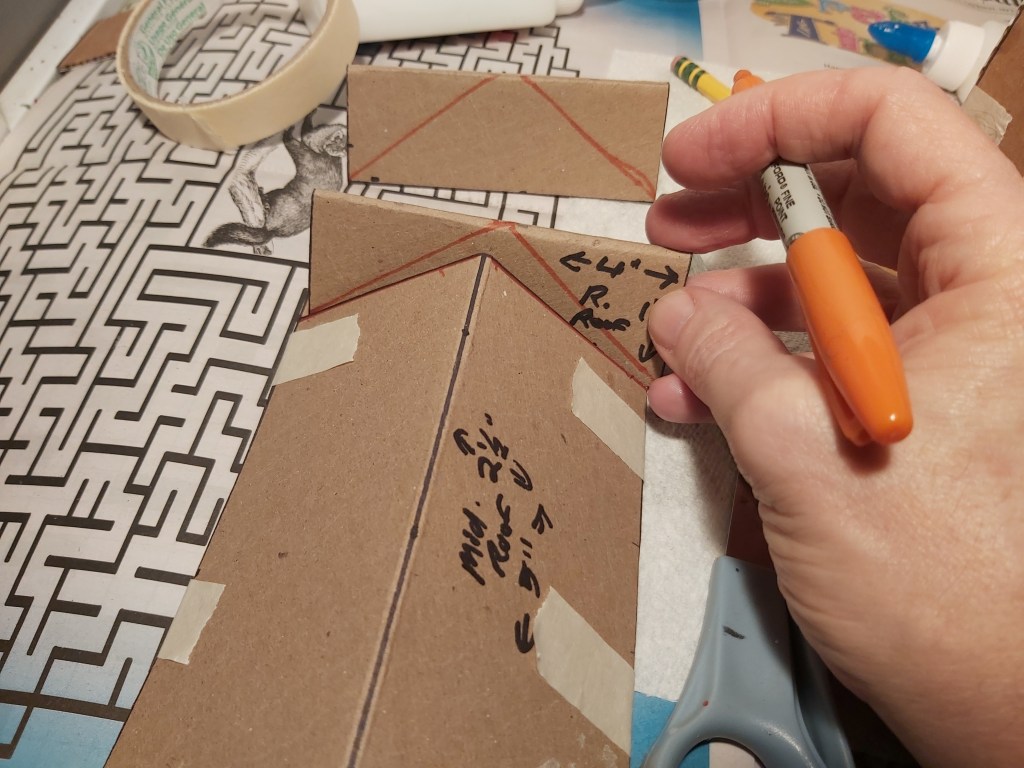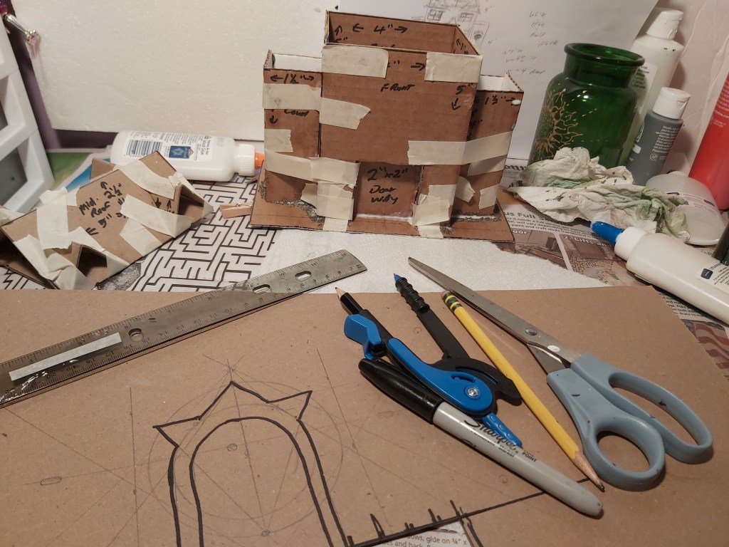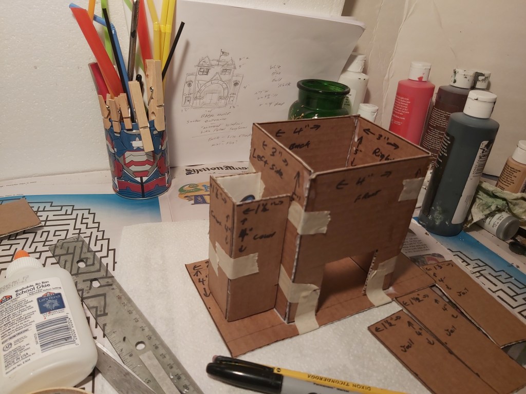 If working from a picture or drawing, don’t worry about being exact. Inspiration came from badges and mirrored patrol glasses this time. Mark, measure and cut corrugated cardboard. Base: 8” wide x 4” deep, front and back 4” wide x 5” tall, left and right 3” wide x 5” tall. Side buildings, add 3 sides each of 1 ½” wide x 4” tall.
