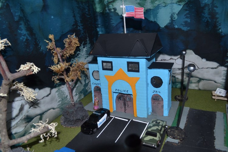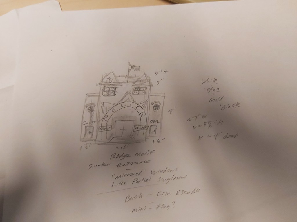 Use a computer printer or fine tipped permanent black marker to add the POLICE DEPT. sign lettering above the central door, COURT to the left door, CORRECTIONS to the right door. Thank you first responders!