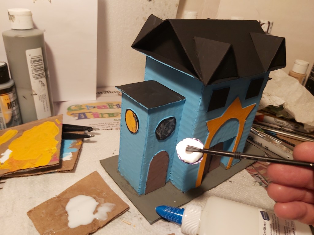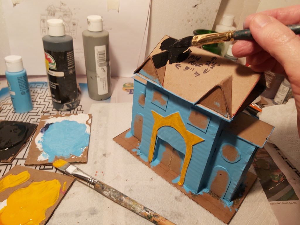 Mark, measure, and cut thin cardboard for doors, windows and entry details. Glue on, let dry. Mix a bit of sand and glue with paint. Paint building sky blue with gold trim, black roof, grey base. Touch up, let dry. Cut flat toothpicks for door handles, paint in brass, let dry, and glue on. Cut and glue tin foil for windows.