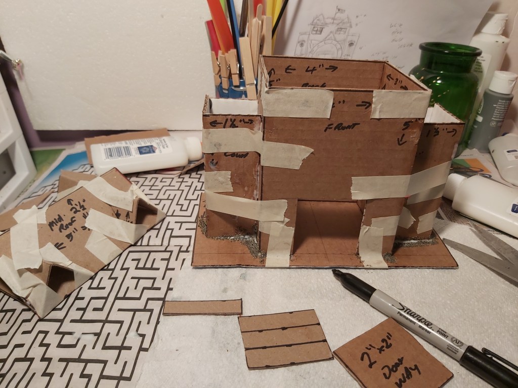 Cut a 2” square entrance in the front wall, set the removed square aside. Align, adjust and glue the walls to the base. Add masking tape to hold in place until dry. Cut 3 strips of thin cardboard, 2” long x ½” deep and glue the 2” square back for the recessed entrance. Let dry.