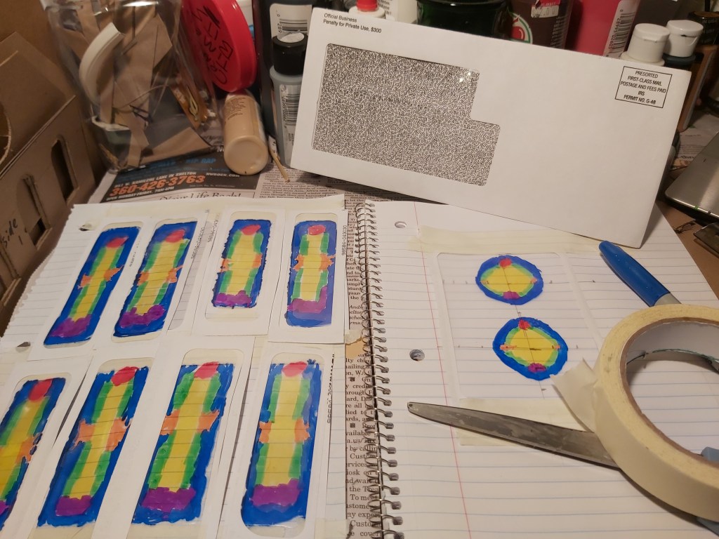 Using the clear plastic from some old junk mail window envelopes, fill all the space with colors and designs of your choice, saving the black for later. Once the ink is dry, carefully glue another clear piece over the top. Set aside.