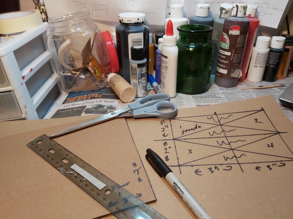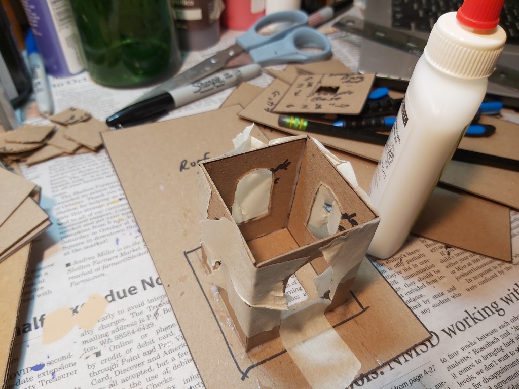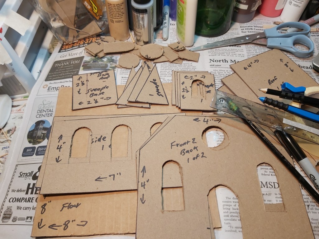 Mark and cut from cardboard: Steeple peak – mark four 2” x 3” rectangles, with 1” marks on the 2” side, cut 4 triangles. Steeple base sides: four 2” x 2 ½” pieces and one 2 1/8” x 2 1/8” base roof. Three roof pieces 8” x 4”. Two front / back panels 7 ½”W x 6”H, mark 4” side heights and 2” in from L. to R., cut angles. Two side panels 7” x 4”. One base, 8” x 8”. Test fit & cut approx. 1” x 1½” windows & doors.