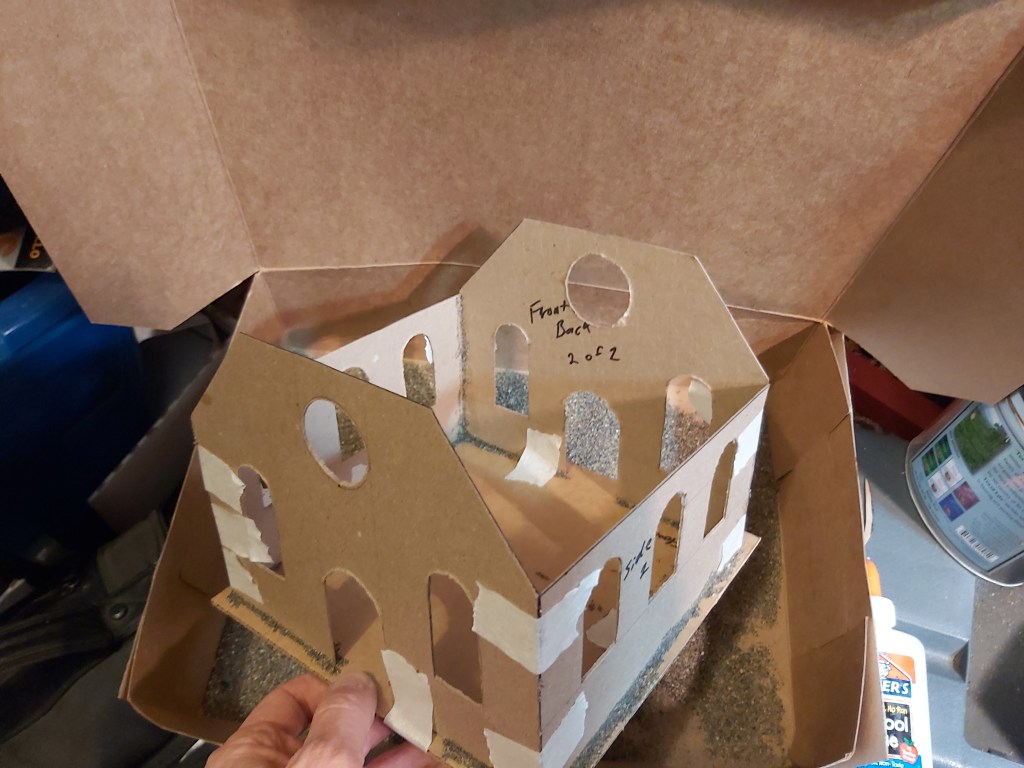 Glue the steeple peak triangles to the steeple peak base roof. Use masking tape to hold it together until dry and set it aside. Glue the steeple base sides to the front of the building’s center roof. The building front back and sides go on the base. Reinforce glue lines with sand, and shake off the excess. Prime with white paint mixed with glue, adding a small amount of baking soda to help fill small gaps. Set aside to dry.