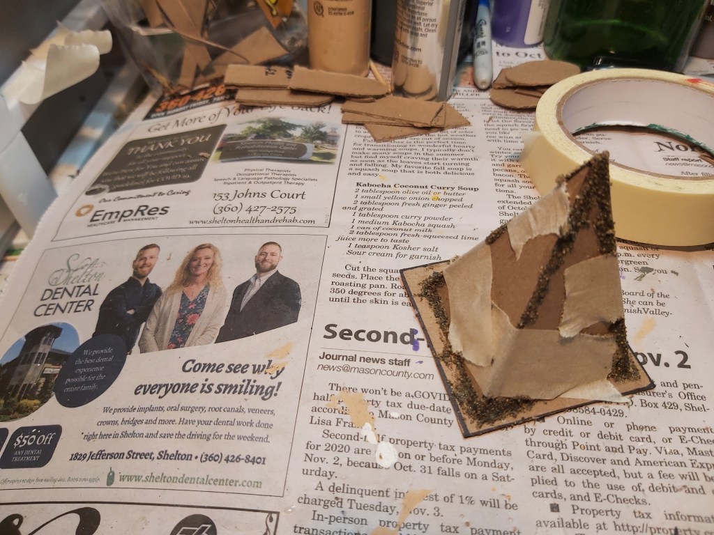 Materials: Old junk mail window envelopes, cardboard, school glue, masking tape, sand, baking soda, acrylic paints, four small round beads, battery-powered tea lights. Total cost: about $2