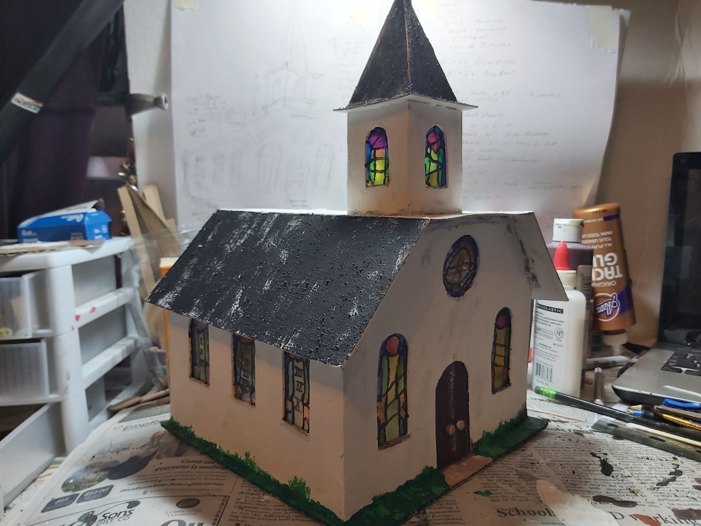 Happy Tree’s citizens need a gathering place for prayer and life events. Here is a classic old country church with backlit stained glass effects. This is fun to make. Enjoy!