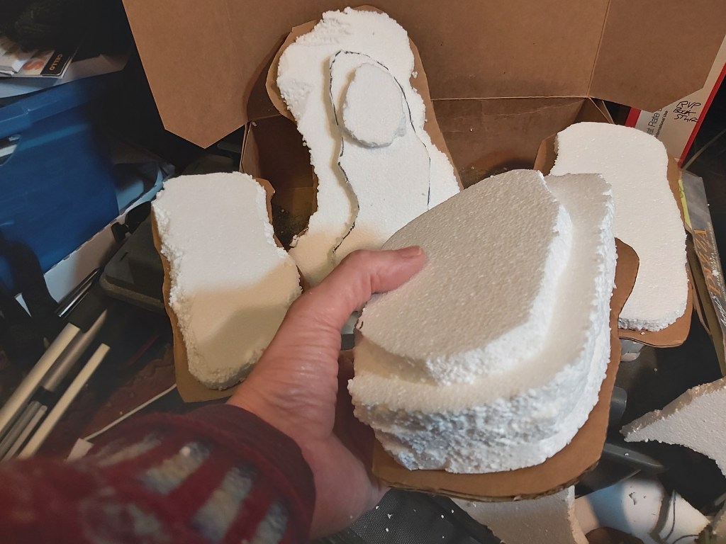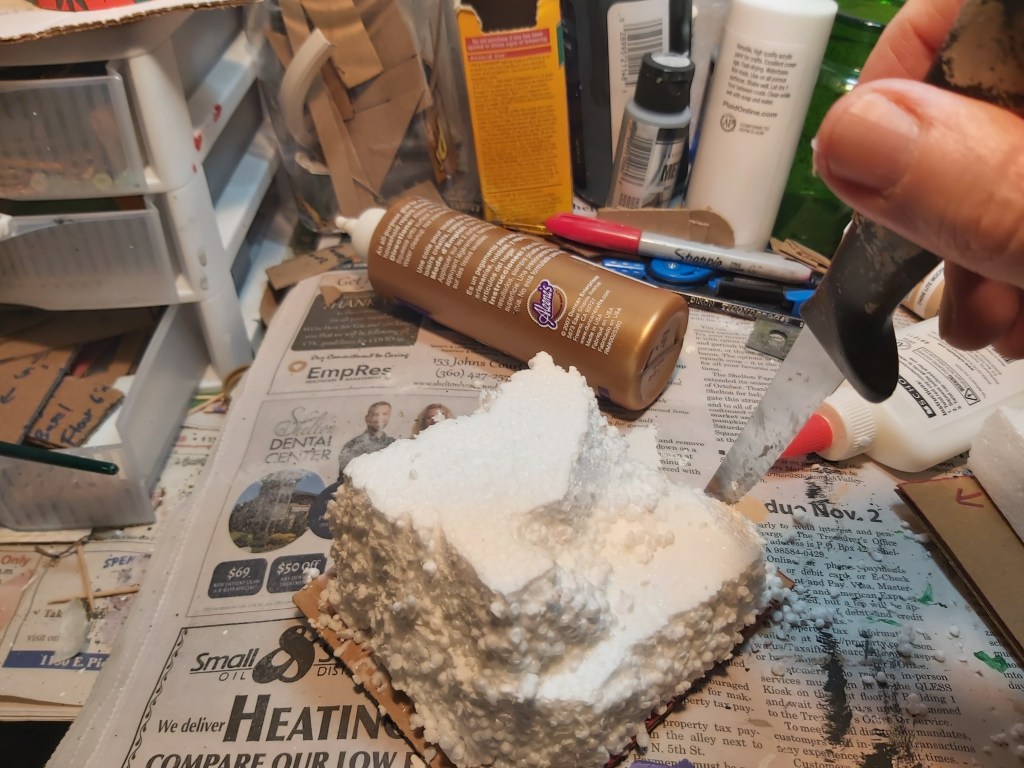With your fingers and/or an old steak knife, break and/or cut and carve the Styrofoam into the hill shapes you want. It makes a huge mess which honestly is part of the fun.
