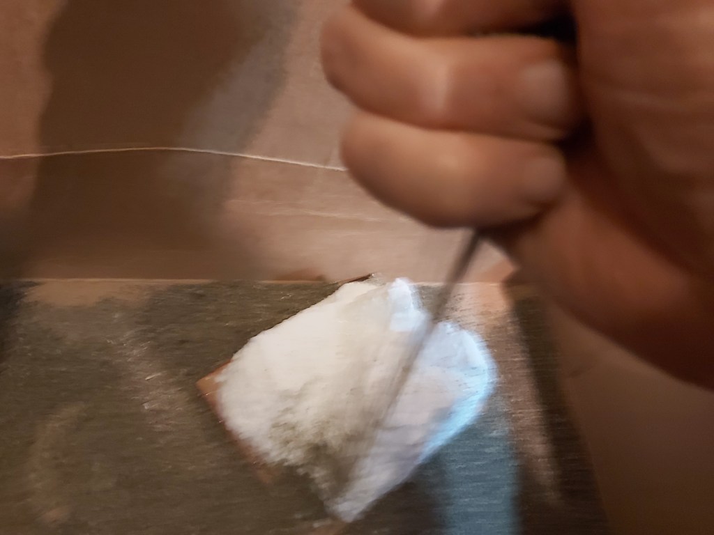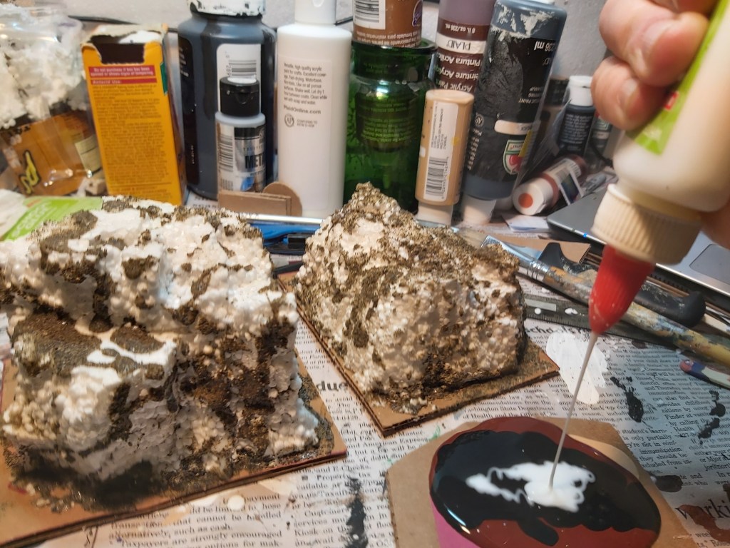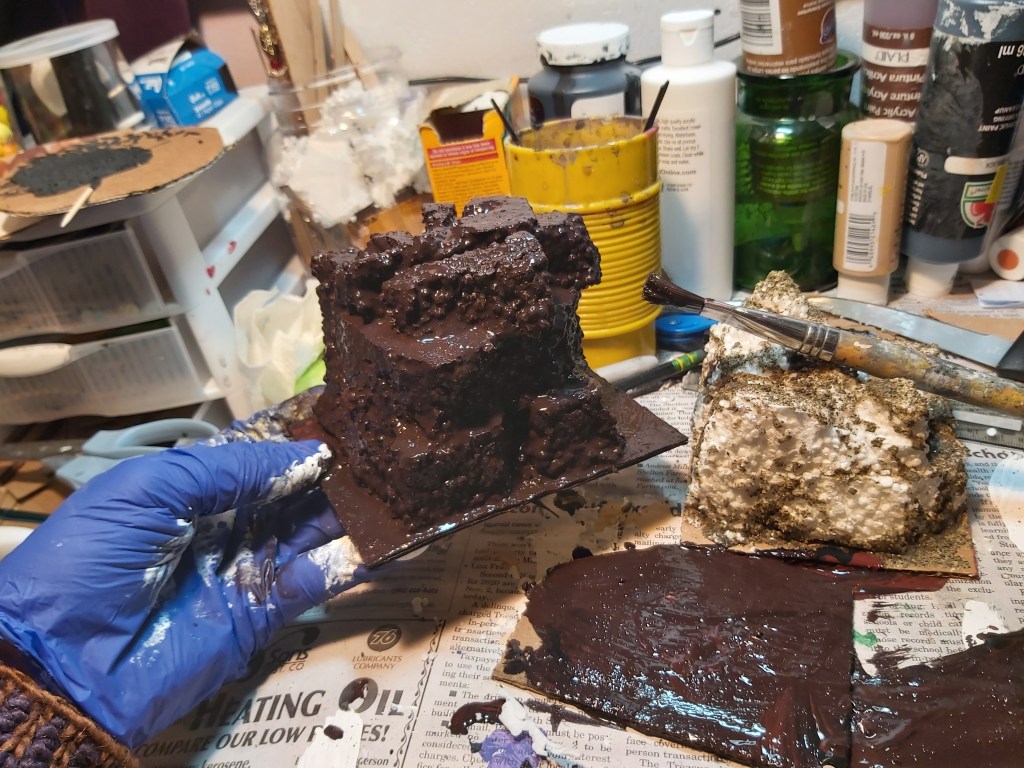 With an old brush, paint glue on areas desired, especially any seam lines or areas that don’t look natural yet. While the glue is wet, grab handfuls of sand and drop it on there. Gently shake off the excess. Let dry. You can also add a bit of sand to your black and brown paint/glue mix for the base coat.