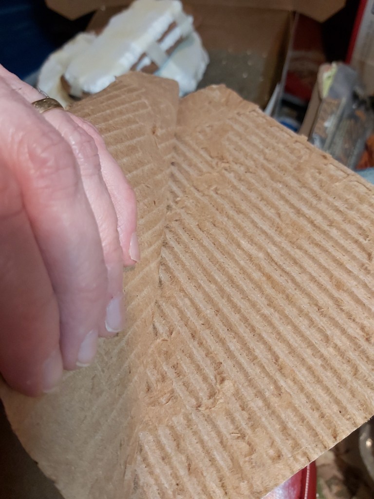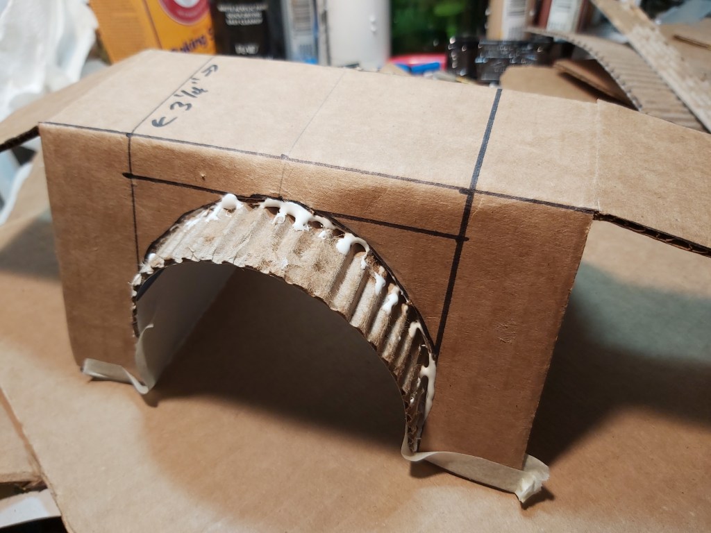 Mark and cut a clean piece of corrugated cardboard with two semi-circles 3” tall x 4” wide, allowing a 3 ¼” central area with ½” gaps and about 5” extra on each side to allow for the road or tracks on top. Allow 1” of width on each side of the tunnel, cut and fold.