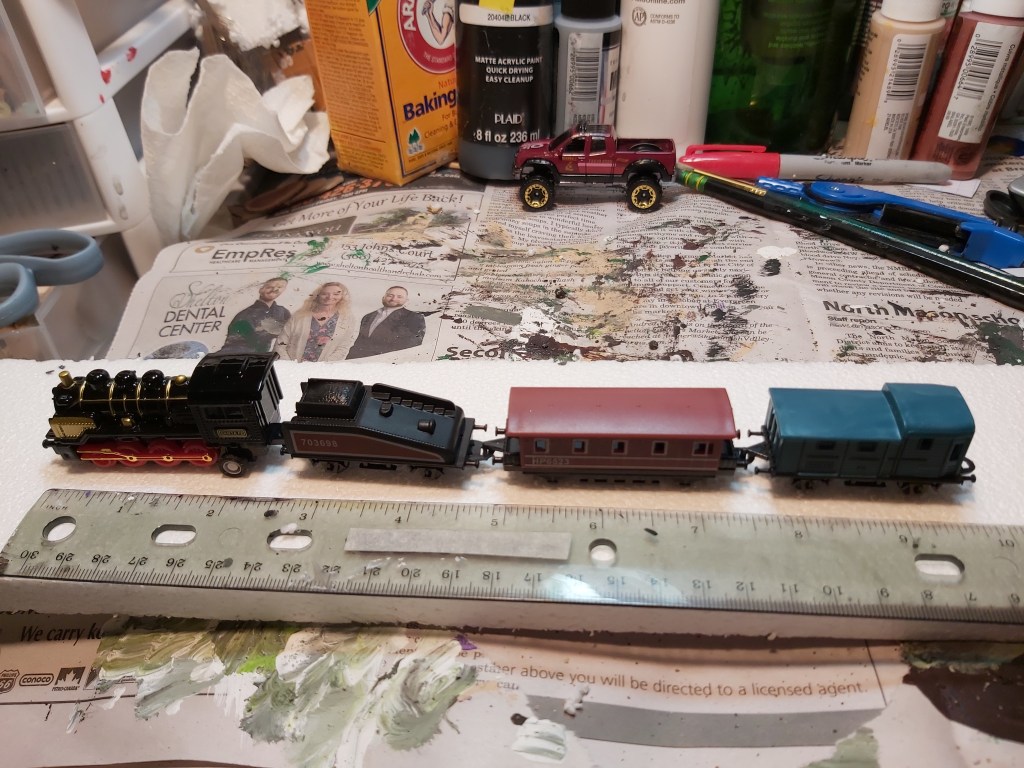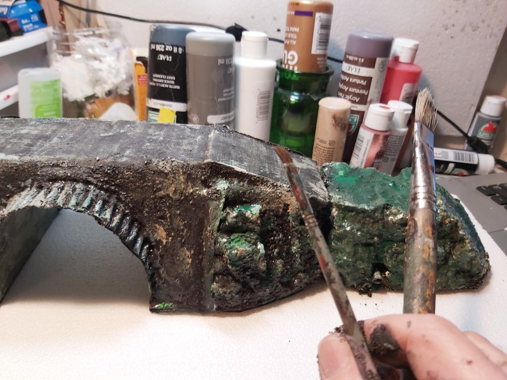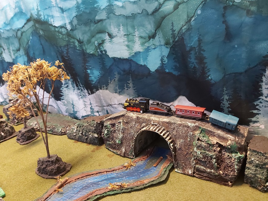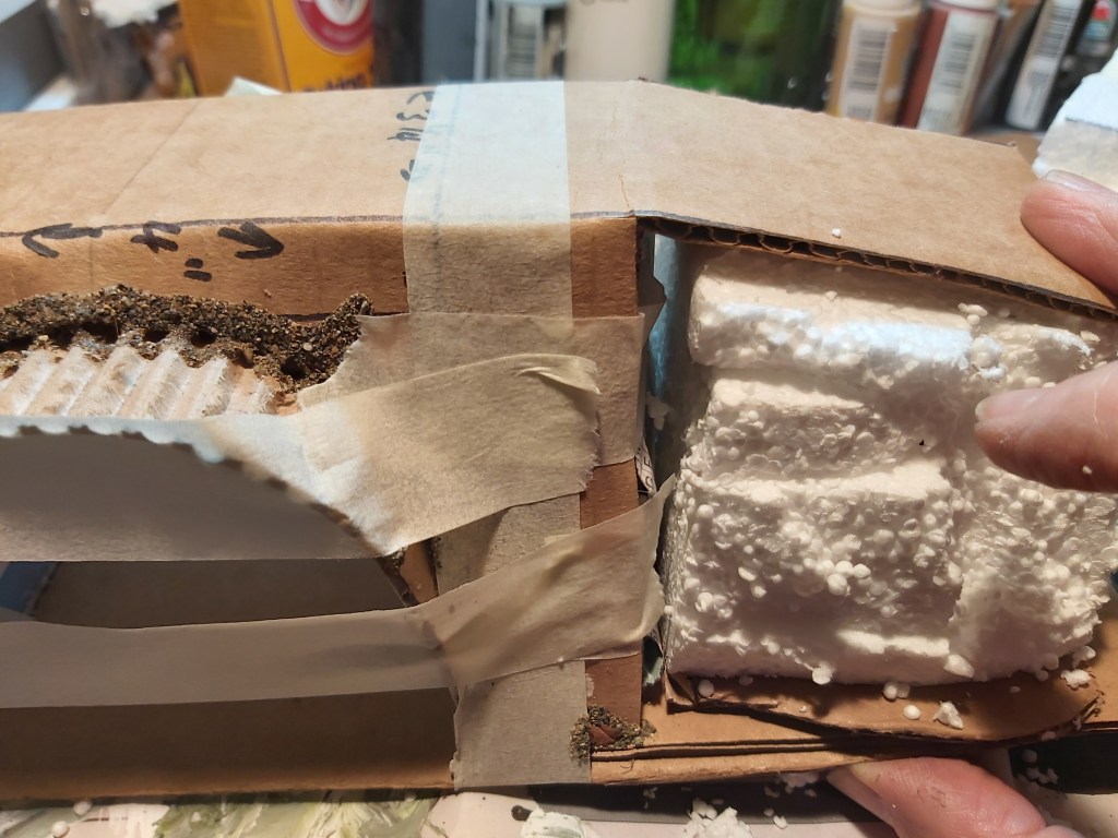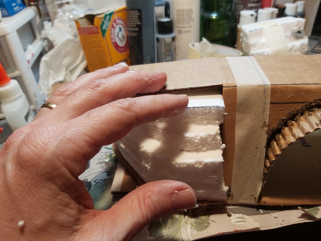 Carve and test-fit Styrofoam hills for each side. Glue each in place. Fill gaps with glue, sand and masking tape. Tip: if you have snacks, eat them now before you get paint on your fingers!