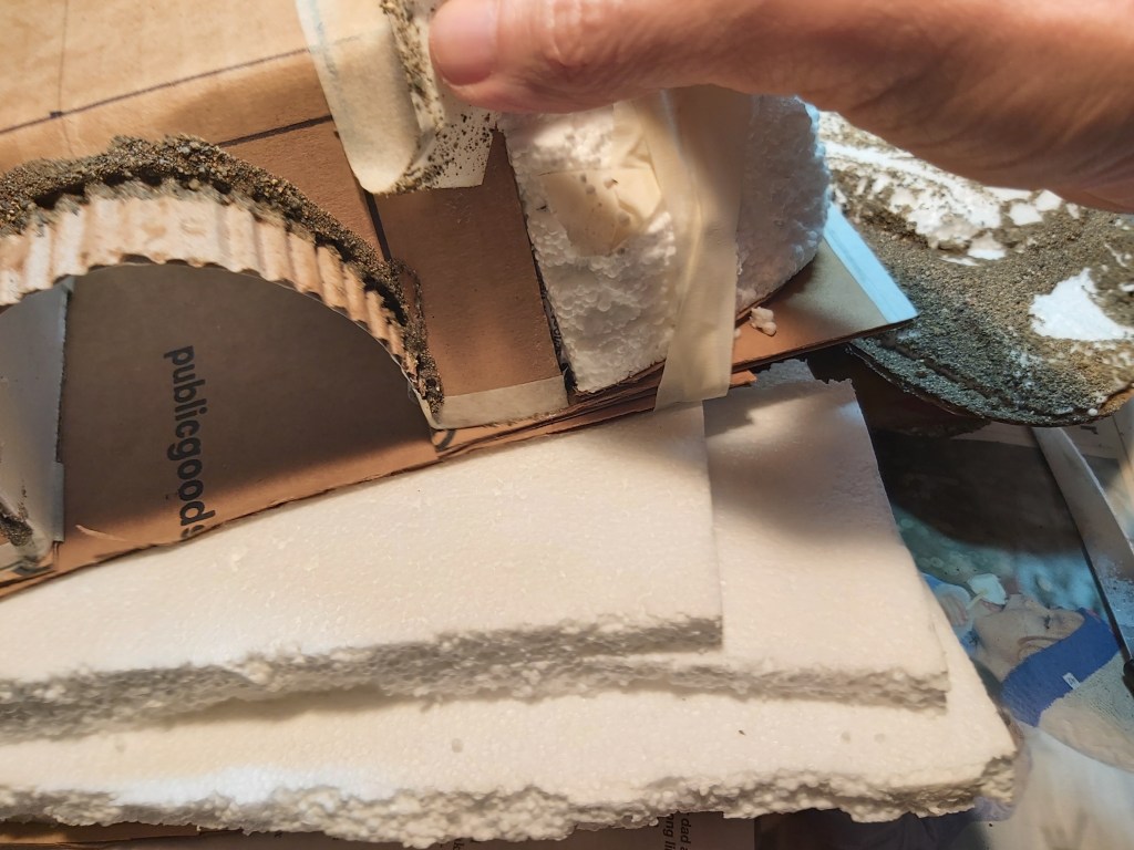 Materials: cardboard, newspaper, Styrofoam, school glue, masking tape, sand, acrylic paint