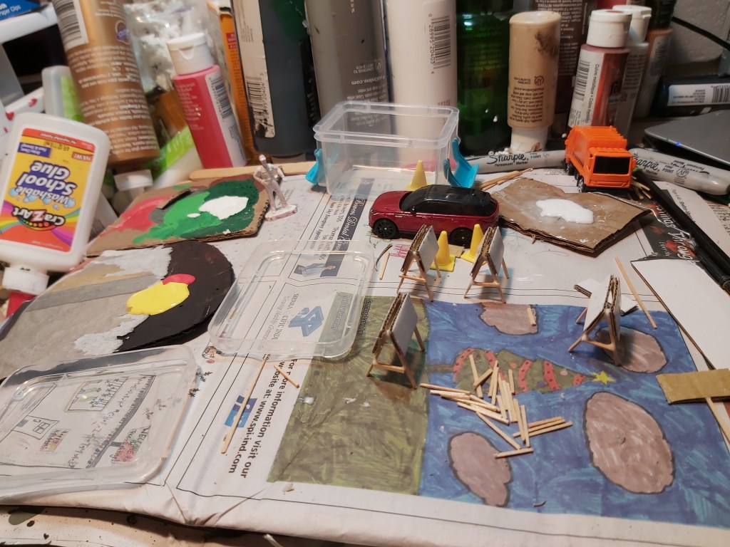 Add layers of glue and sand to cardboard, and paint black. Let dry. Add more glue, sand and bits of dry white and grey paint from an old palette, for the look of asphalt and broken concrete. Lightly paint highlights of brown and tan for dirt and tire tracks. For the port-a-potty, paint a cardboard box, ¾” on each side and 1 ½” tall then add detail with a marker.