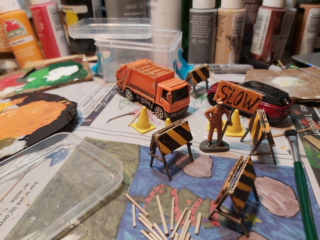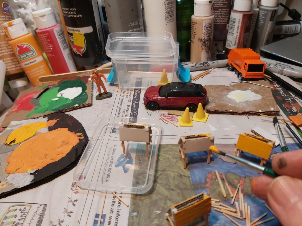 Measure and cut eight cardboard rectangles, each 1” wide x ¼” tall. Trim 16 flat toothpicks to 1 ¼” length for legs, and eight to ½” for side supports. Place cardboard flat and glue legs to the sides. Allow to dry, and then glue the tops and sides. From the side view, they make the letter “A.” Prime in white, then grey legs, orange sign. Let dry, then use a black marker for stripes.