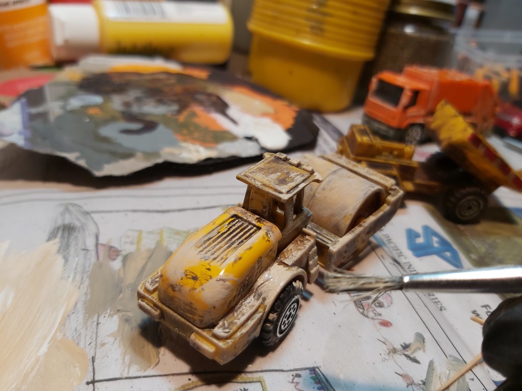 New construction vehicles are clean and shiny, but at work, they show a lot of grit! Weathering is fun and easy to do. Let’s create a construction site!