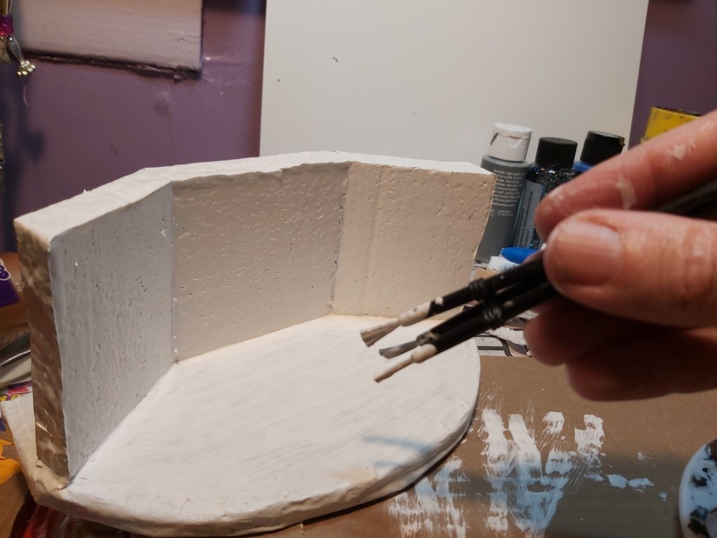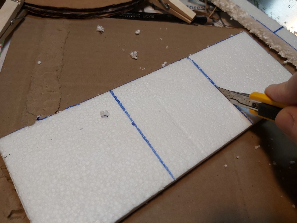 Mark and cut three 3” x 3” Styrofoam squares. Test fit, and miter the corners if desired. Glue to the base.