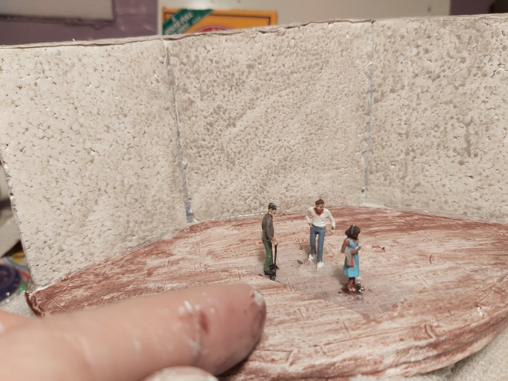 Materials: flat cardboard, Styrofoam, oatmeal container, masking tape, white glue, sand, paint.