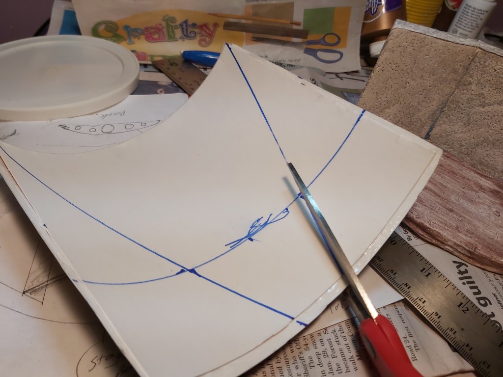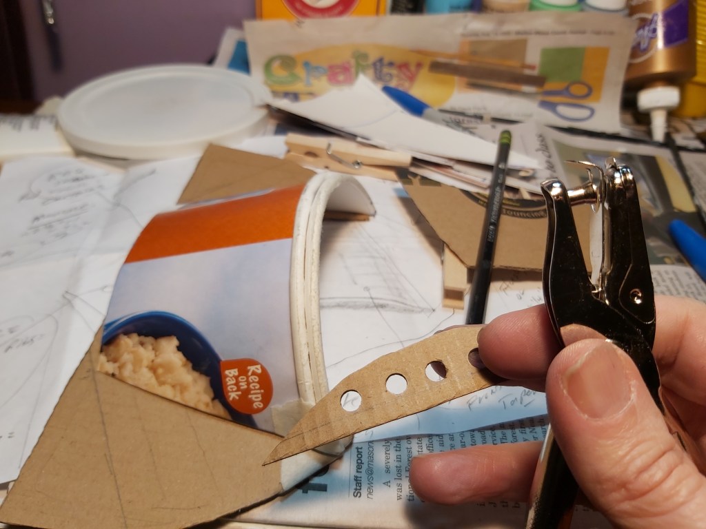 Glue the extra base template to the top. Cut the oatmeal container into two half-cylinders. Test fit, and trim to an angle, glue together. Test fit and cut a back piece from cardboard, and use the hole punch to add design elements. Cut the base template down, allowing about a ½” ledge along the front walls. Glue together.