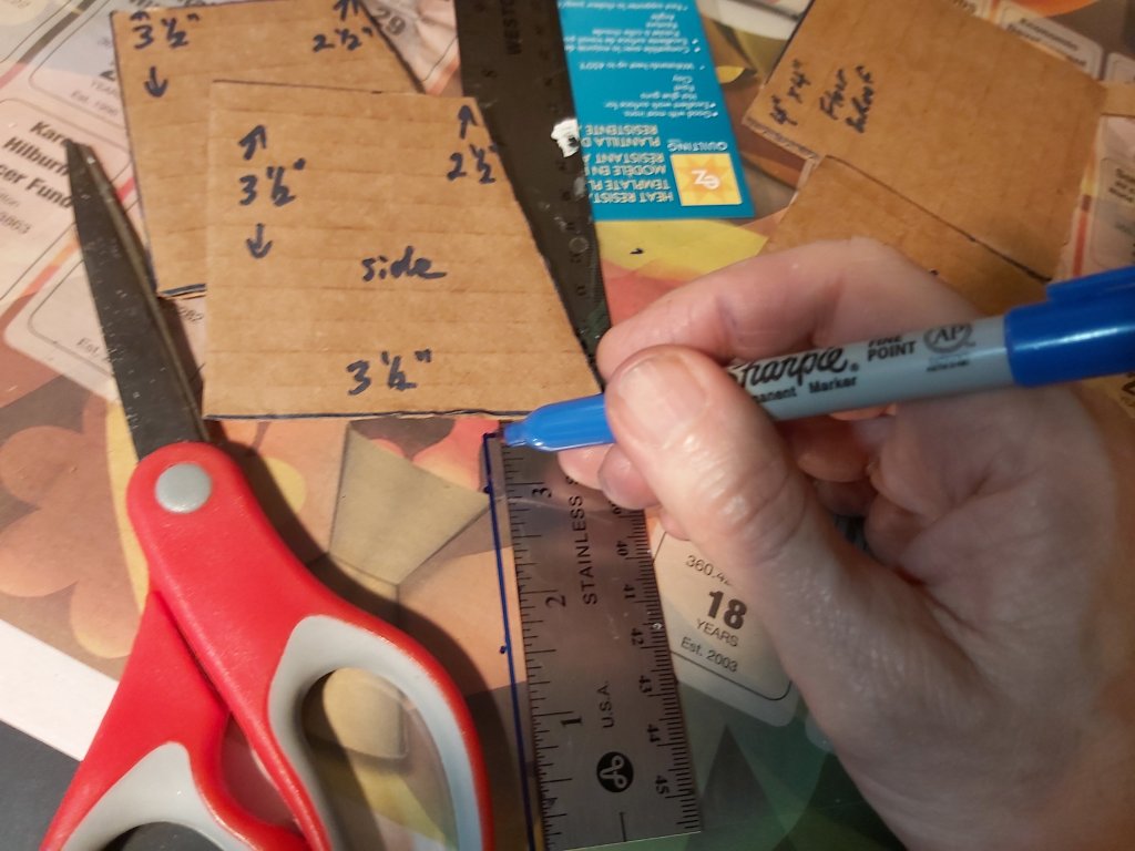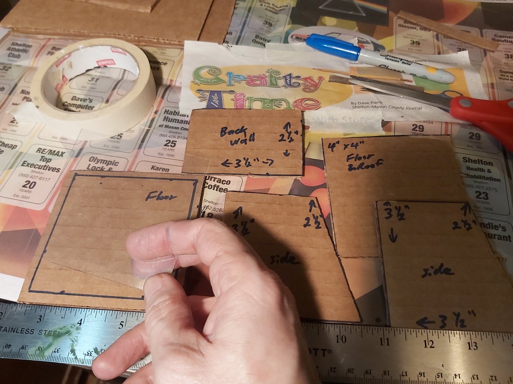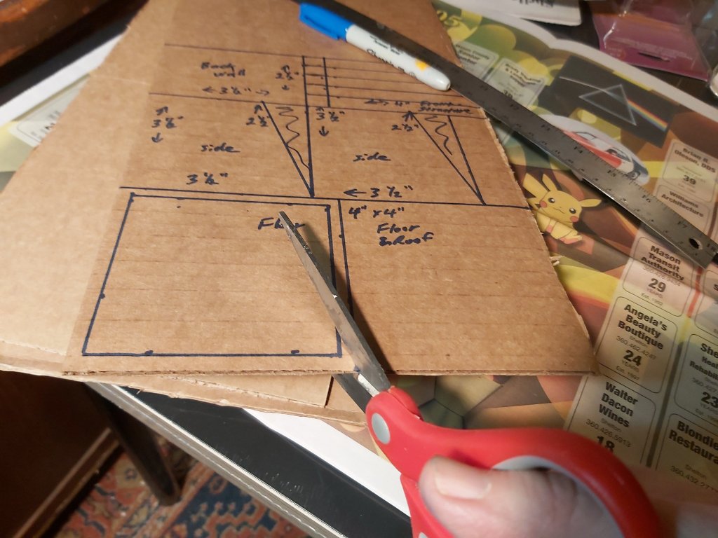 Clearly mark cardboard for 4”x 4” floor and roof, 3 ½” x 2 ½” back wall, 3 ½” x 3 ½” side walls. Mark slope on side walls to 2 ½”. On the floor piece, also mark a 3 ½” x 3 ½” square for placement later.