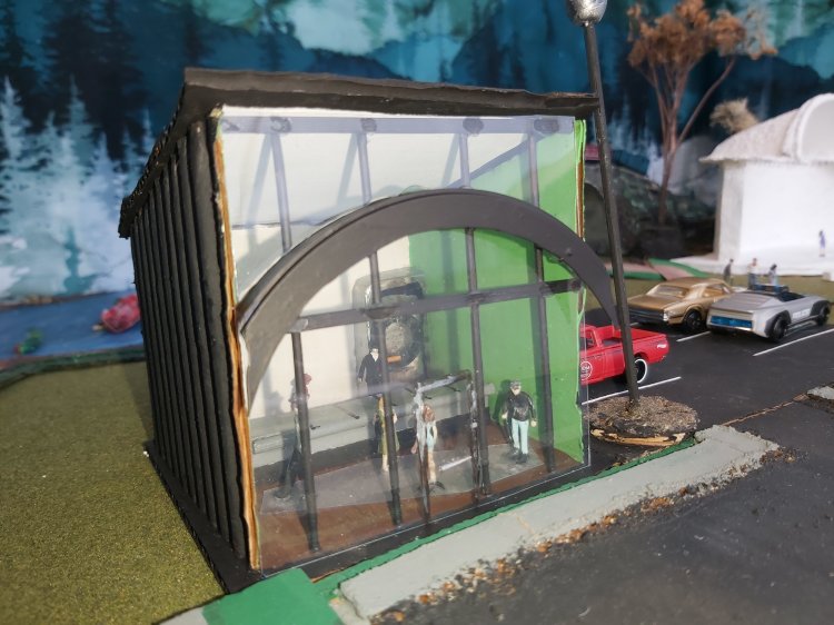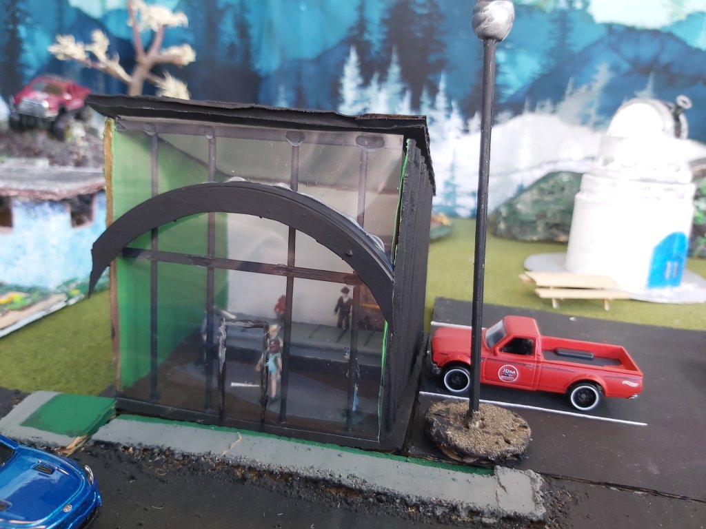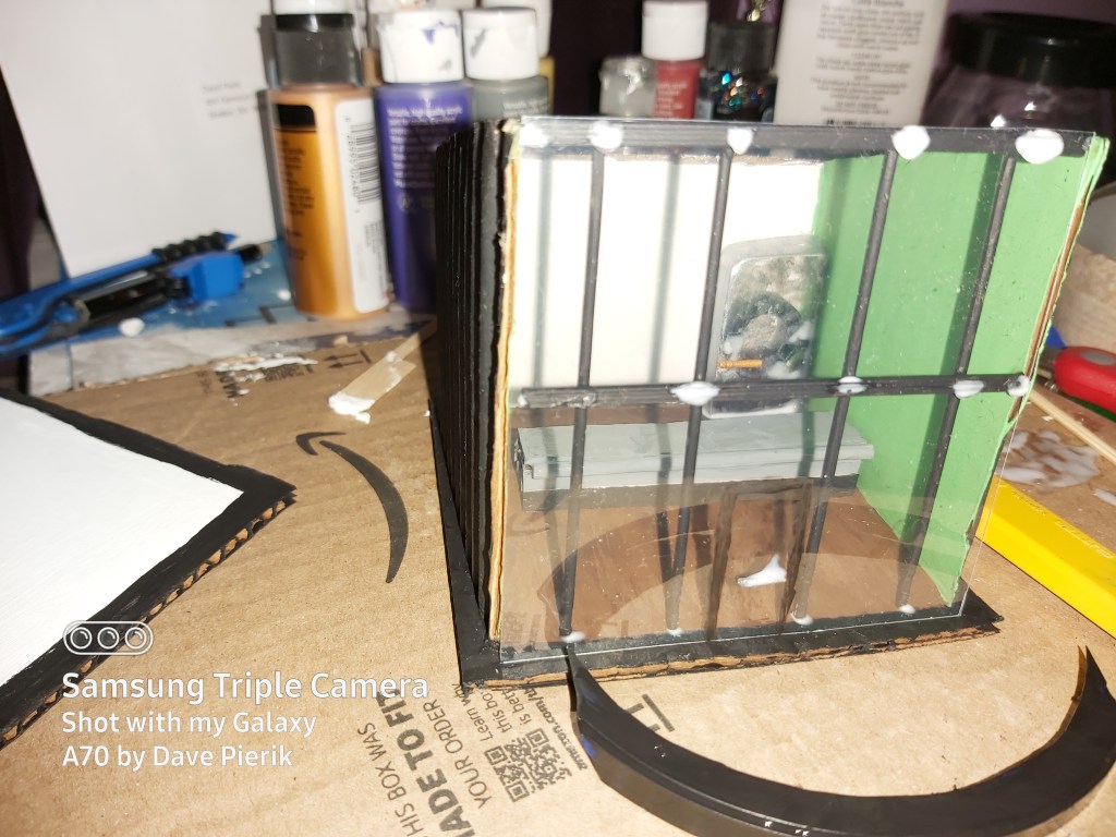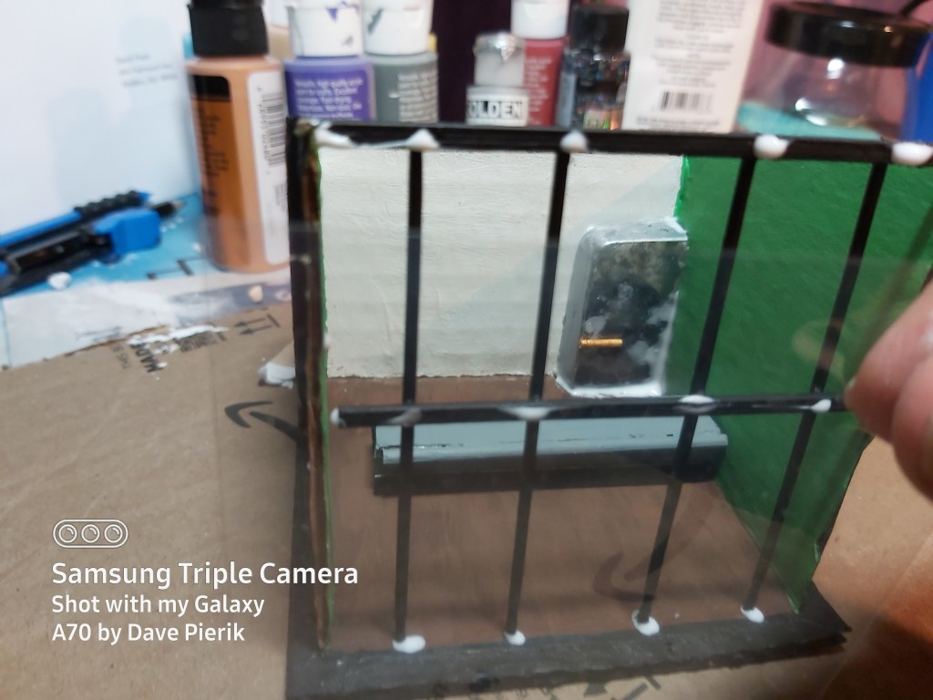 Be sure the glue and paint are dry on the black sticks for the front wall. Align and glue in place, adding dots of glue for the clear plastic. Be patient. Note that school glue dries clear.