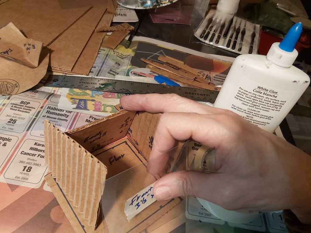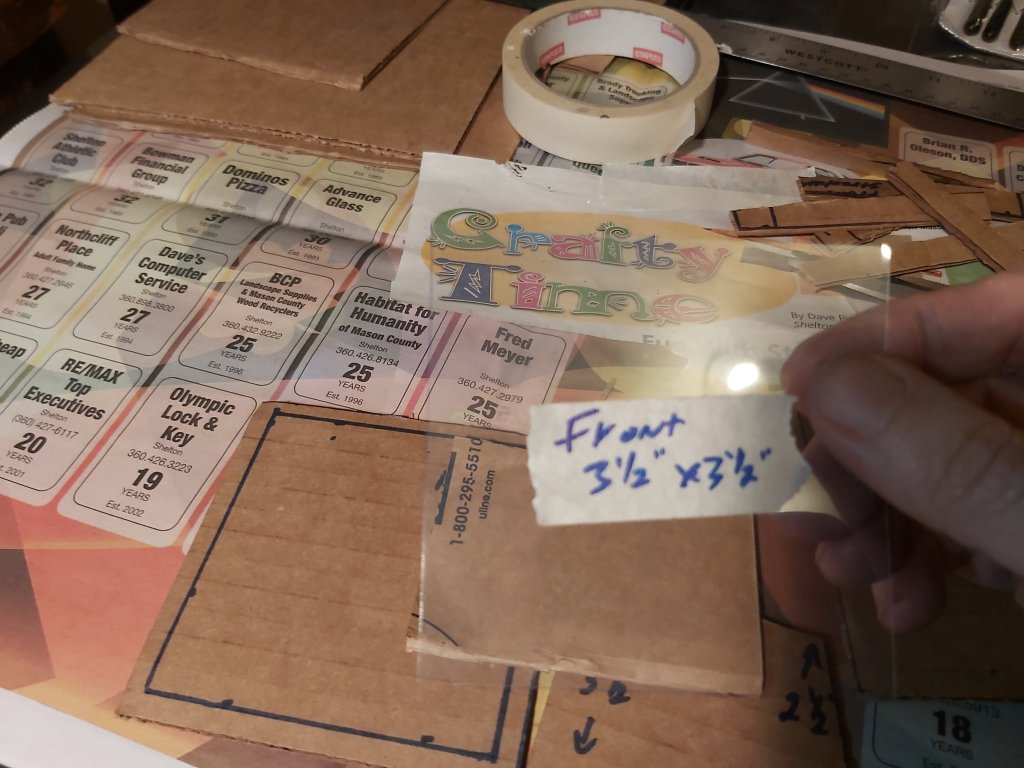 Cut a 3 ½” x 3 ½” square of clear plastic for the front wall. Test fit with the other pieces.