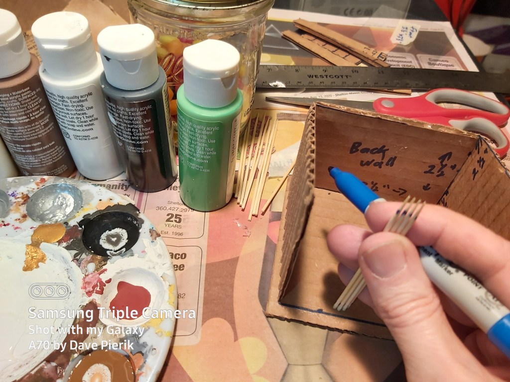 Mark 6 craft sticks at 3 ½” lengths, and cut. You will need these for the front entrance.