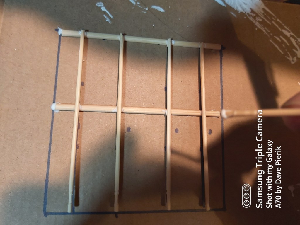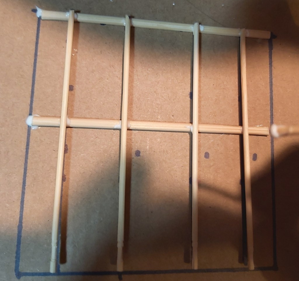 On a piece of cardboard, mark a 3 ½” square. Mark a horizontal guide at 2” and vertical lines ¾” in from the left and right, leaving a slightly wider gap in the middle. Glue sticks together, let dry and remove from cardboard.