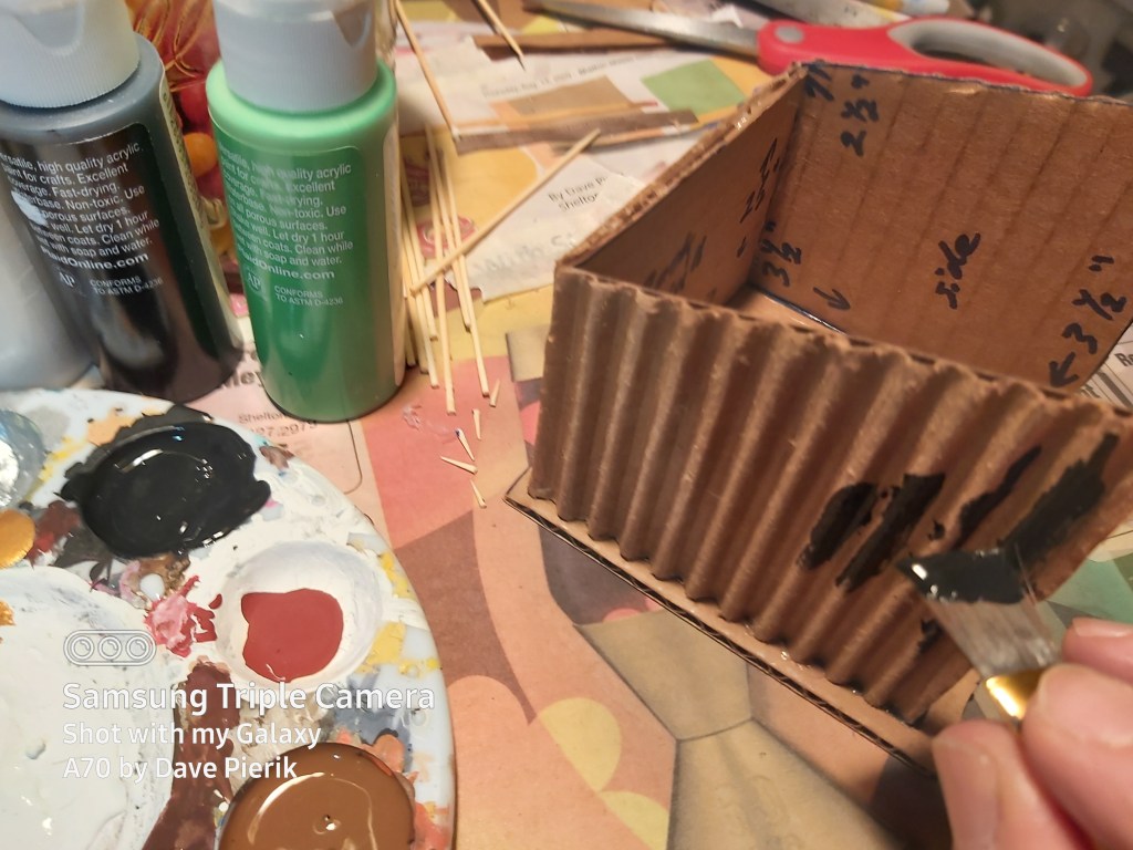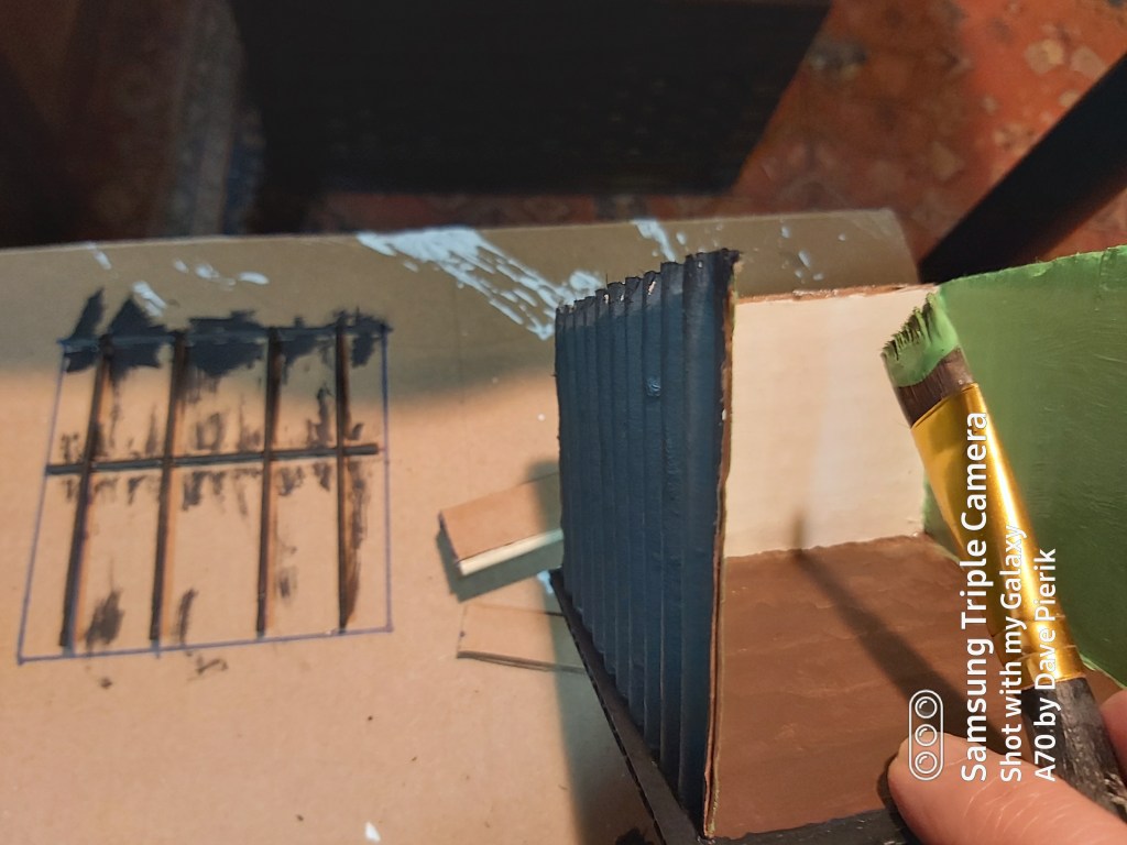 Paint the outside walls, entrance bars and top of roof black, the floor brown, the inside of the back wall and bottom of the roof white and the side walls green.