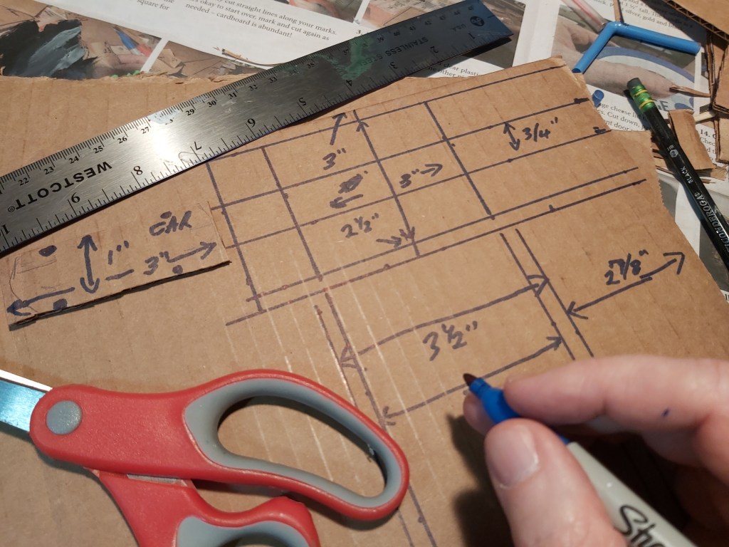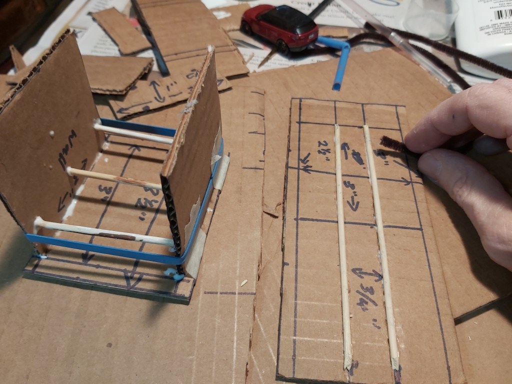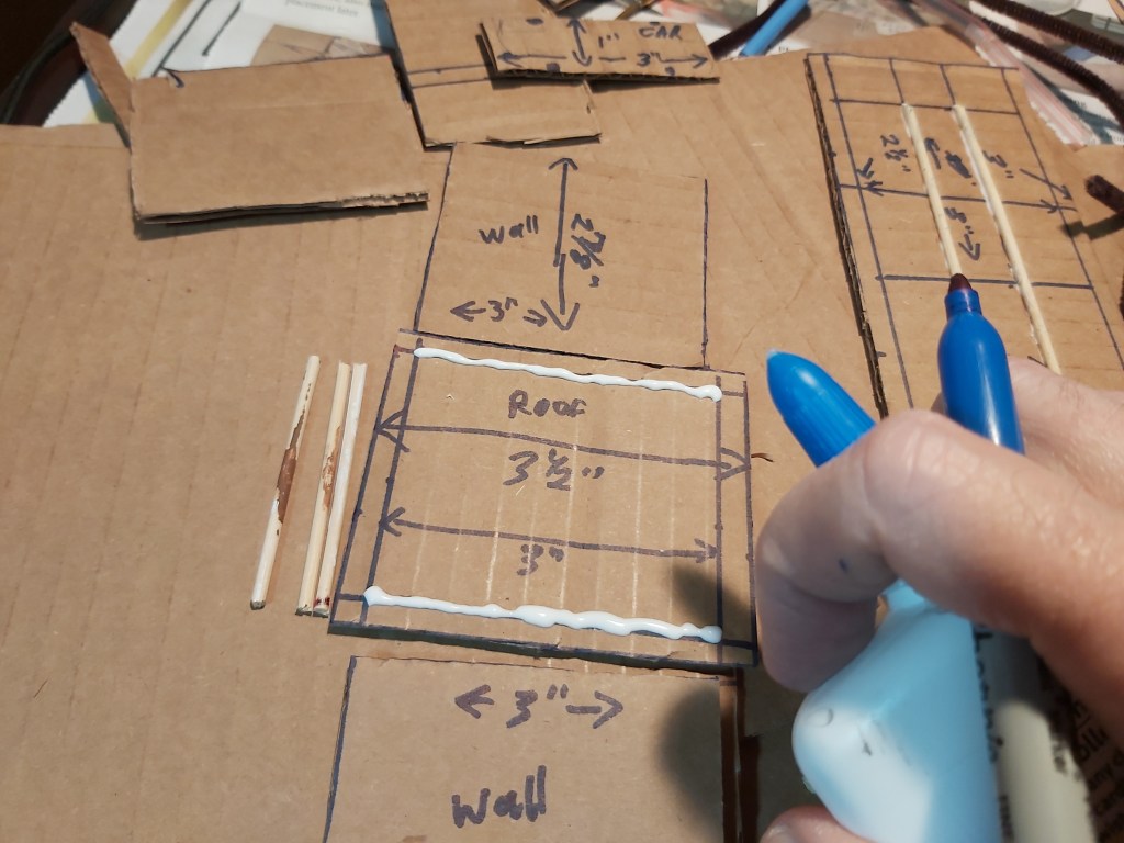 Measure and mark cardboard. Base: 3” wide x 7” long with guide lines ¾” apart in middle and ¼” from outside edge. Roof: 3 ½” x 3”. Walls (2) 3” x 2 7/8”. Cut pieces. Work grooves along the ¾” middle lines. Measure 2 bamboo skewer sticks to 6” lengths and cut at angles for car wheel ramp conveyer-guides. Glue in.