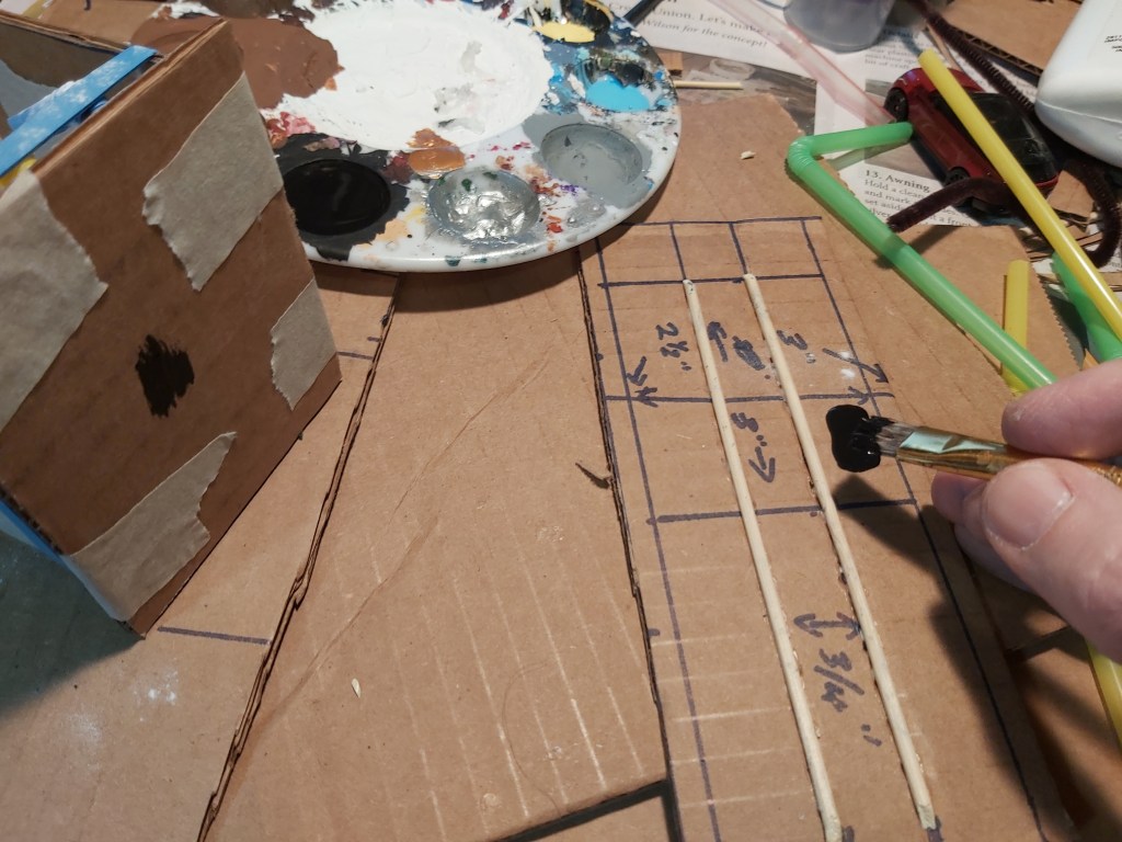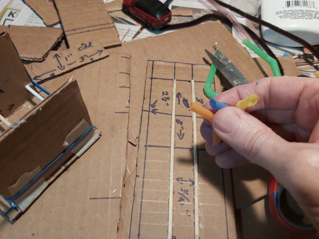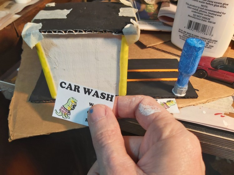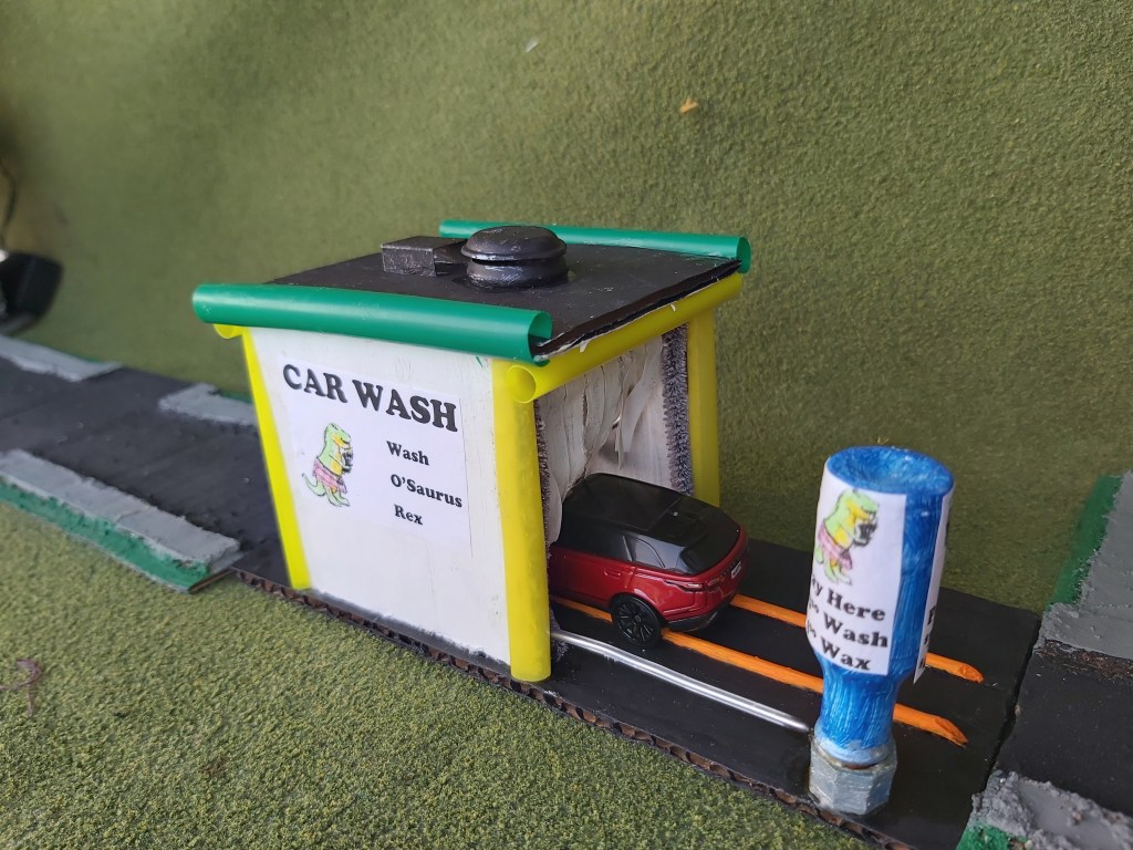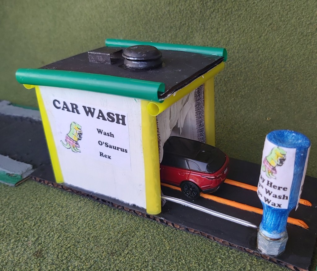 Cut and glue pipe cleaners for washers, bendy straws for blow-dryers and other elements to the sticks, allowing room for 1” wide vehicles to pass through the car wash. Use masking tape to hold parts in place until glue dries, and then carefully remove the tape. Paint the roof and asphalt black.