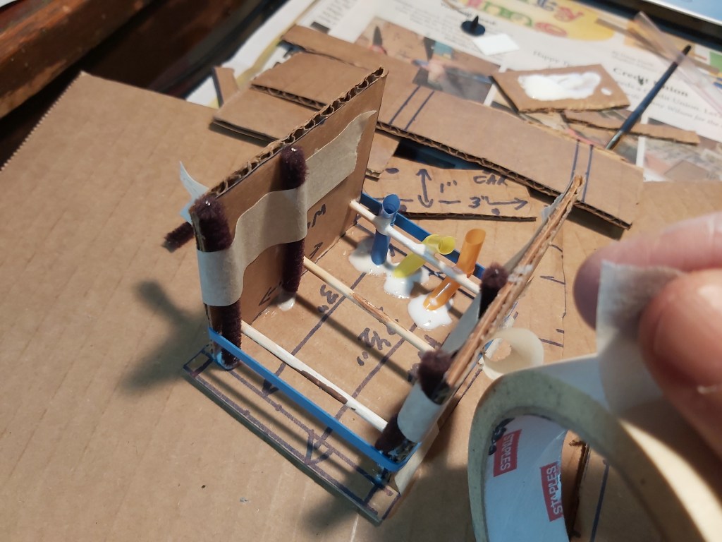 Materials: Cardboard, white glue, masking tape, paint, craft sticks, straws, pipe cleaners, newspaper